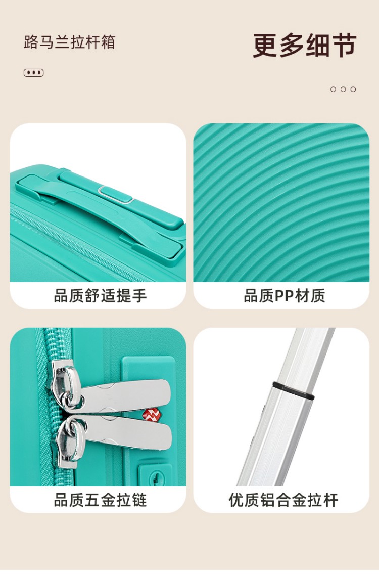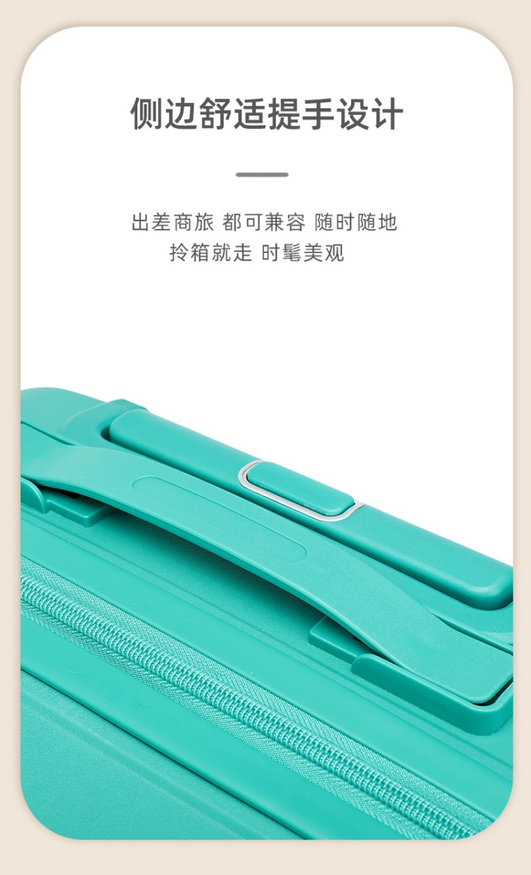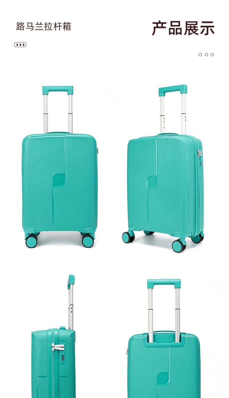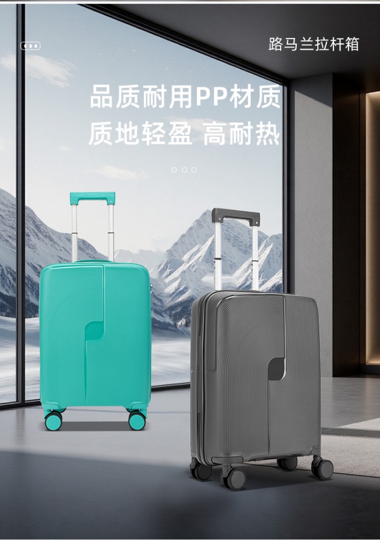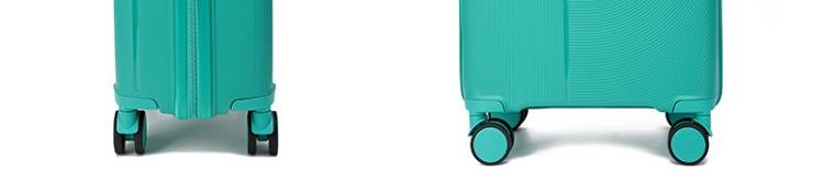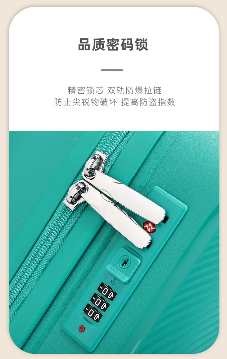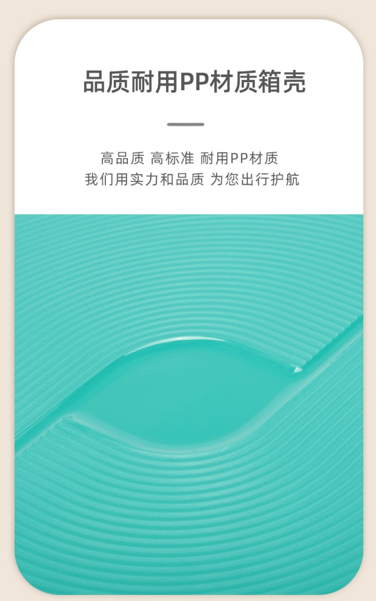 產(chǎn)品賣點(diǎn):PP材質(zhì),結(jié)晶度高,拉桿箱表面更加強(qiáng)硬,可以有效的防止磕碰造成劃痕,而且耐沖擊和防水性好;