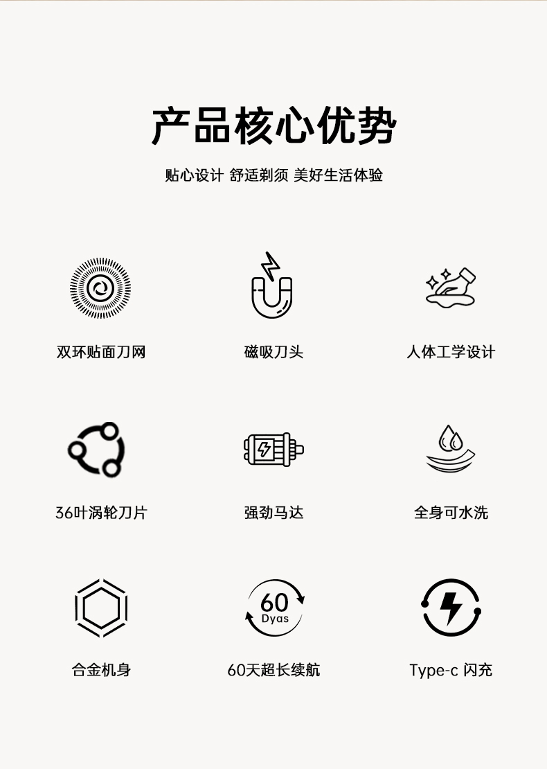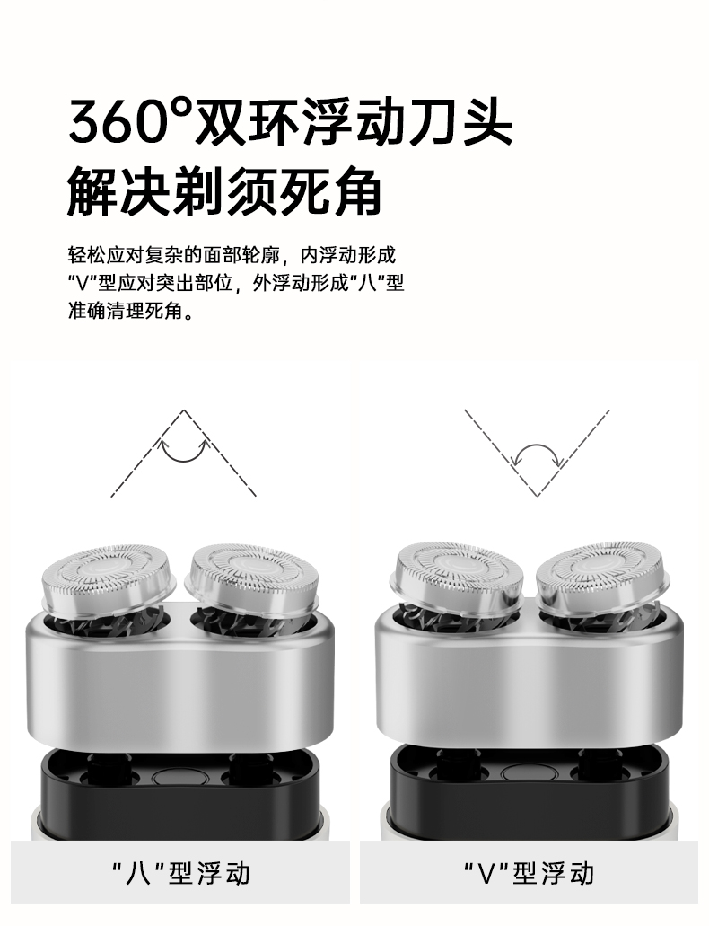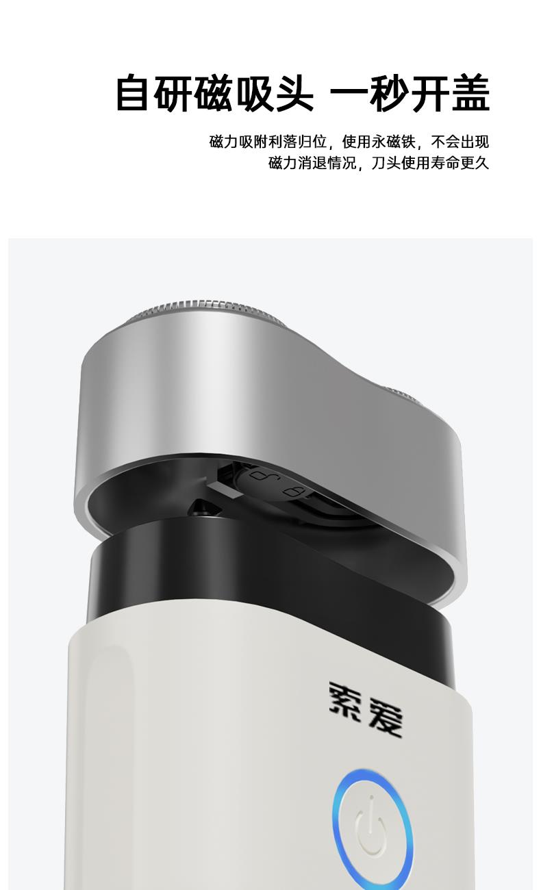 合金機芯/磁吸刀頭/輕薄便攜往復(fù)式剃須刀 越級搭載回轉(zhuǎn)高速馬達/啞面磨砂質(zhì)感/單手可握 隨行隨剃 全身水洗,邊沐浴邊剃須低噪音馬達,做工精致 解決剃須死角/干濕雙剃/5分鐘應(yīng)急閃充 可使用45Min IPX-7級防水 7200轉(zhuǎn)/分鐘高速馬達/低震、低噪效果出眾