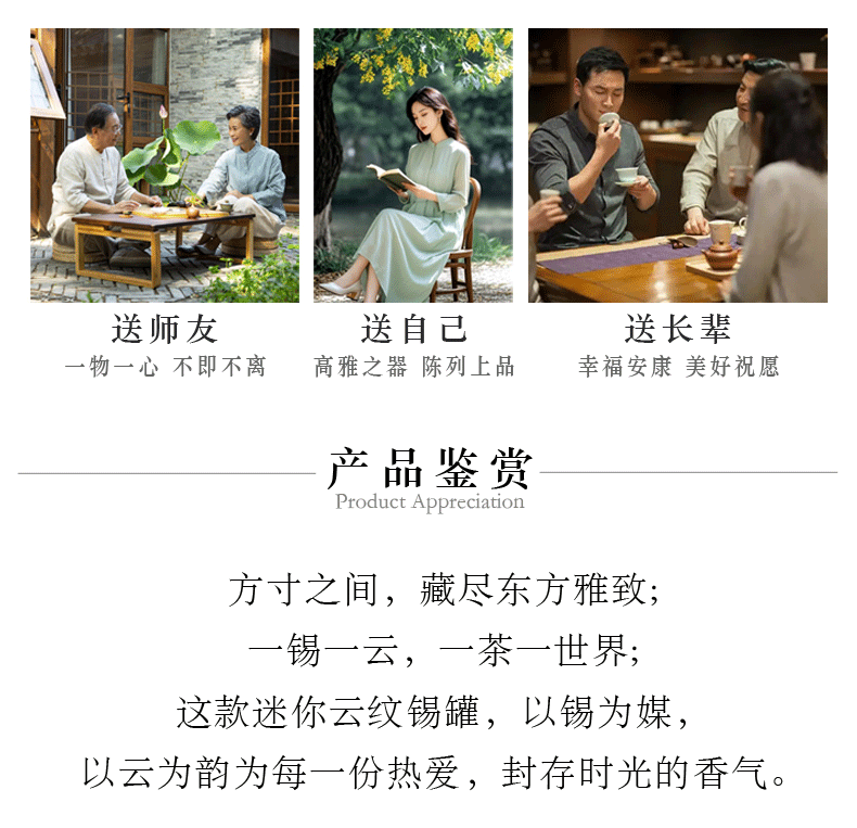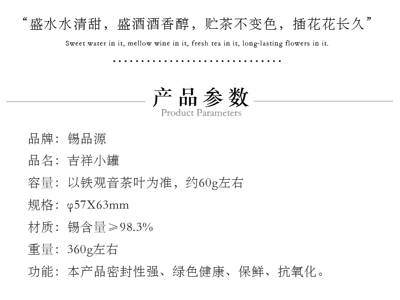 ? 高純度純錫打造:天然儲(chǔ)茶良材,防潮防氧化、密封鎖香,牢牢鎖住茶葉鮮爽本味,啞光拉絲質(zhì)感,越用越溫潤(rùn)。