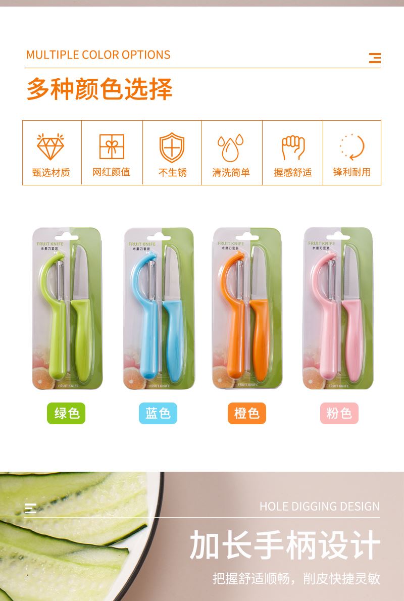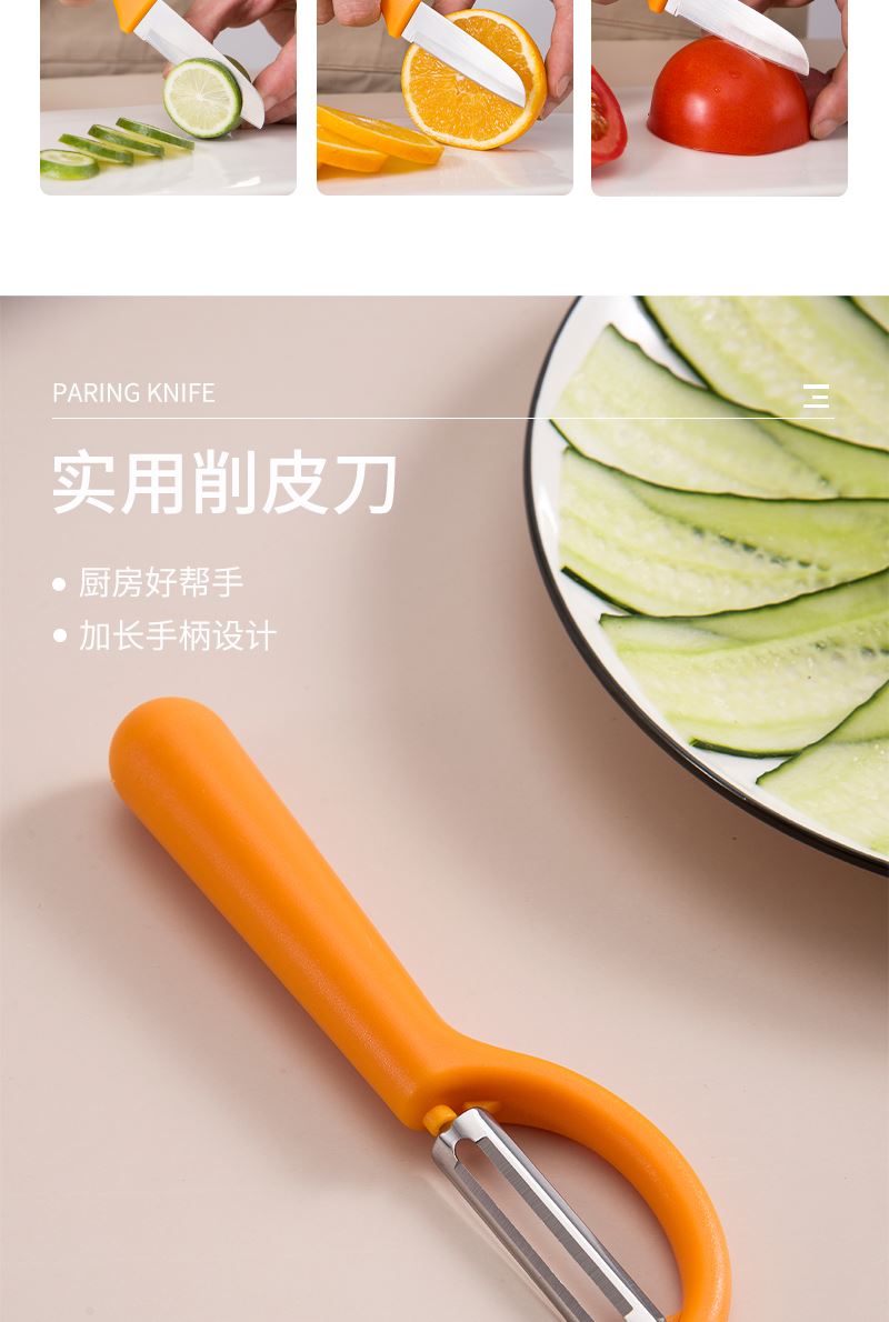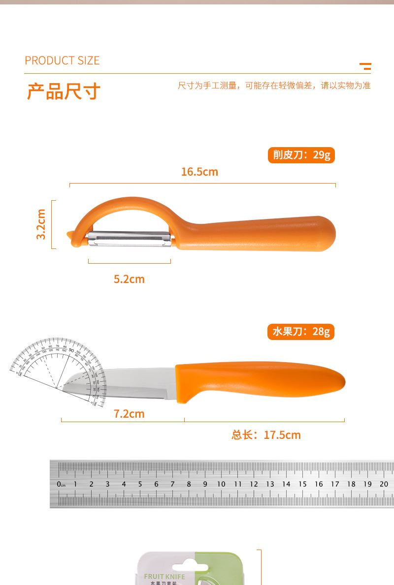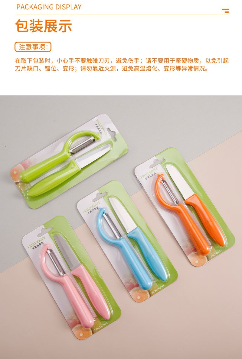產(chǎn)品組合:水果刀 瓜刨 產(chǎn)品規(guī)格: 水果刀:17.5 削皮器:16.5*3.2m 材 質(zhì):PP 陶瓷 包 裝:吸卡 重量/套: 72g