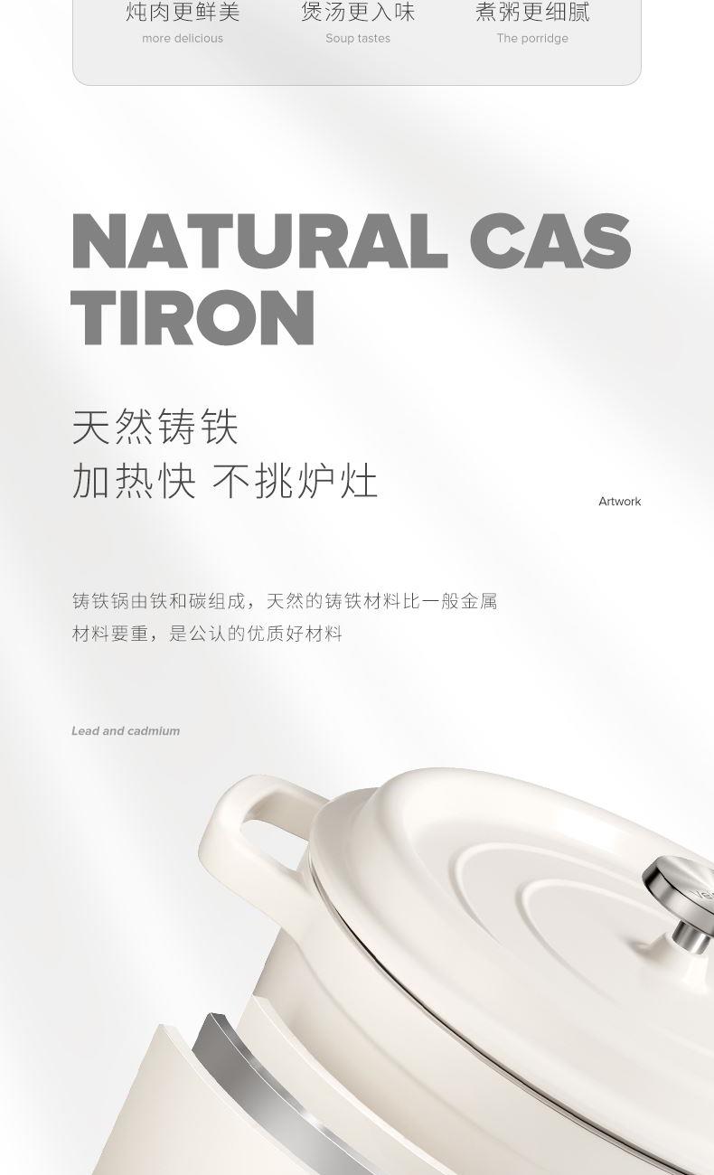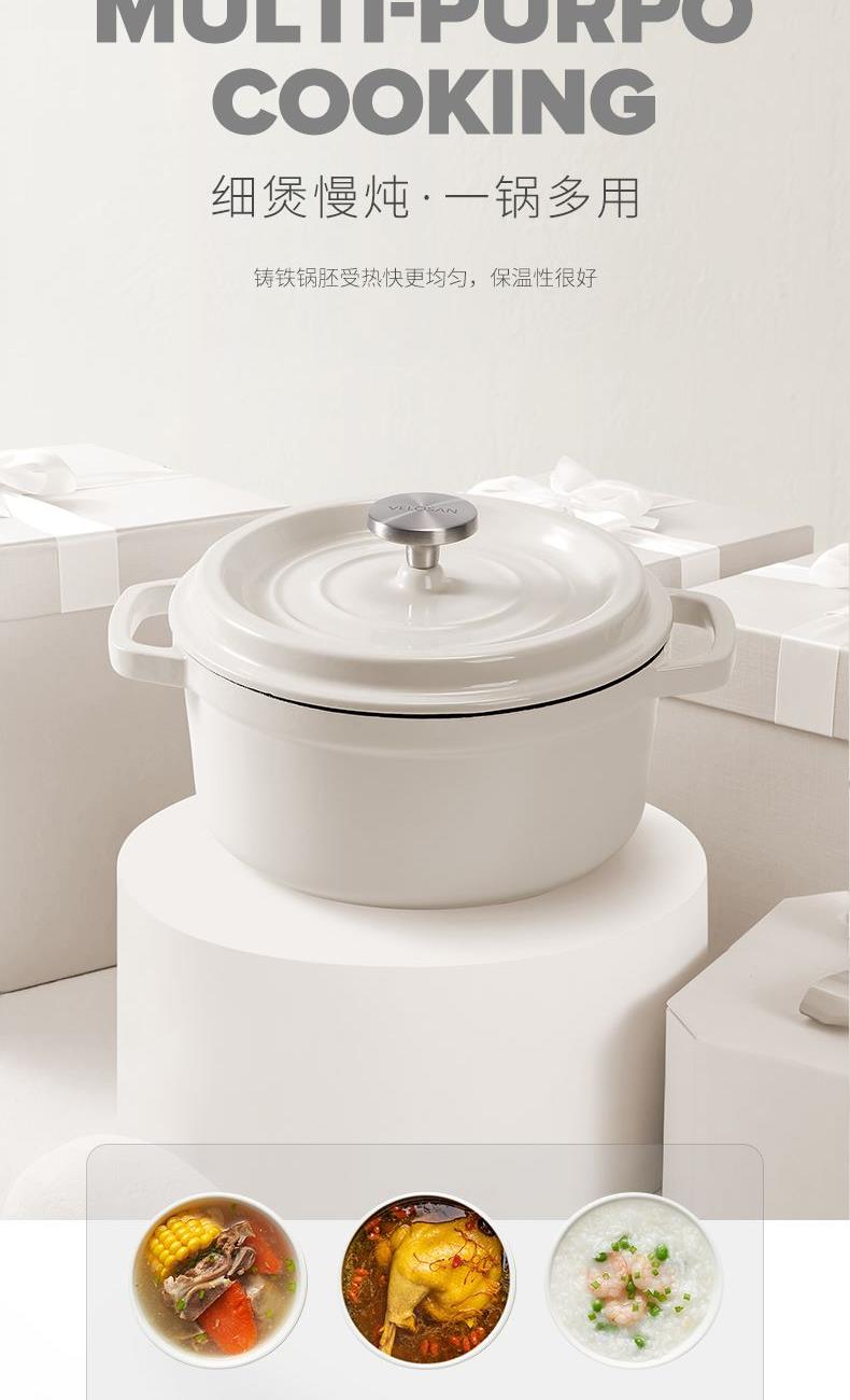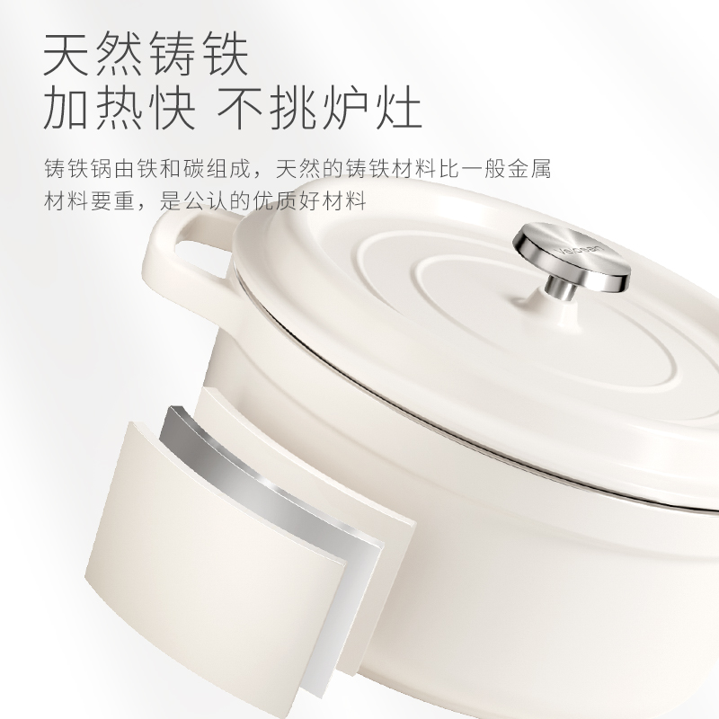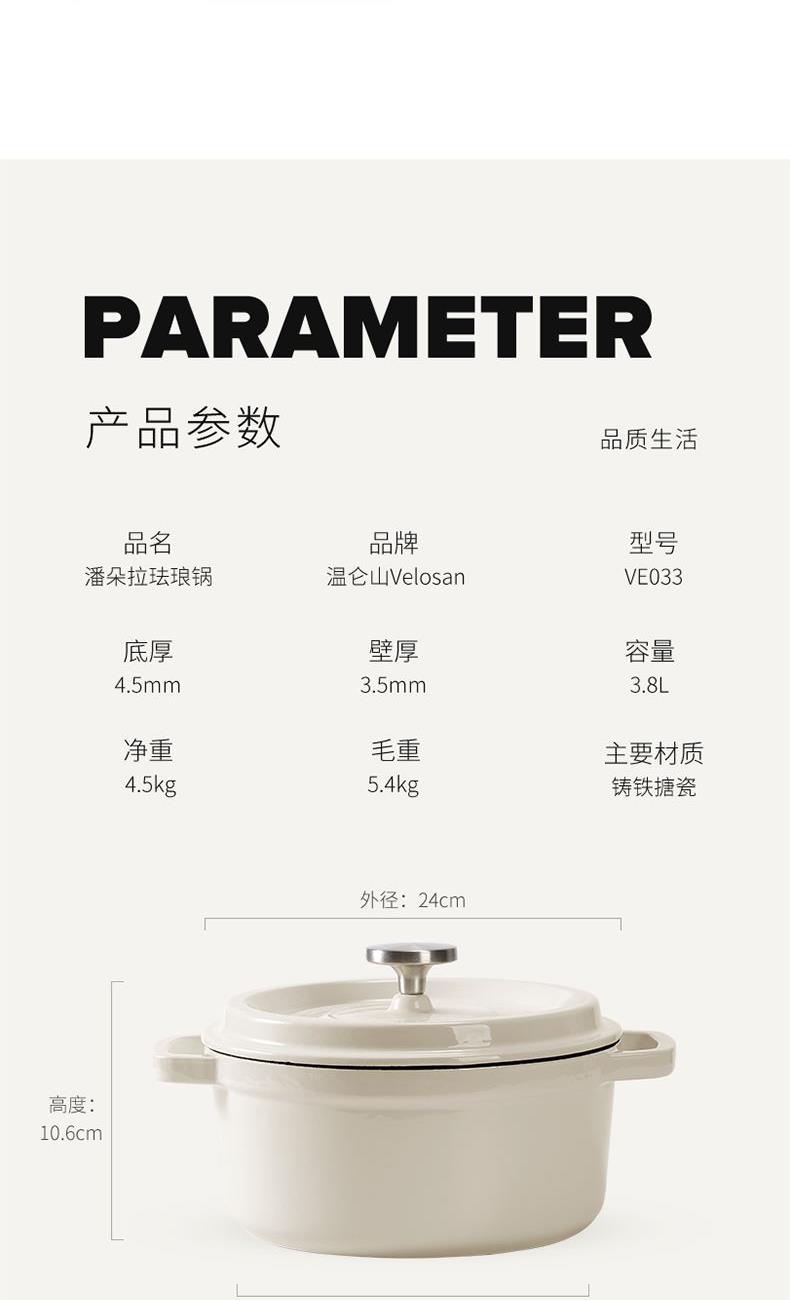 【型號(hào)】VE033 【SKU】VE03301 【材質(zhì)】鑄鐵琺瑯 【規(guī)格】24cm 【凈重】4.5kg 【毛重】5.4kg 【包裝方式】彩盒+郵購(gòu)箱 【外箱尺寸】284*252*147mm 【顏色】白色 【條碼】6972547373258 純白潔凈,隔污防銹; 鎖水凝汁,燜煮入味; 4-5人食,3.8L大容量; 炒煎燜燉,一鍋多用; 天然鑄鐵,加熱快,不挑爐灶。
