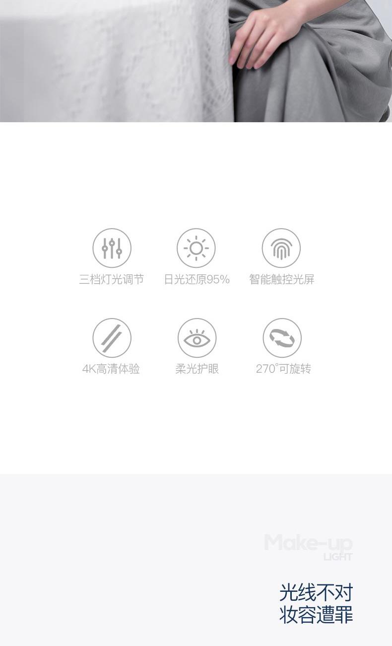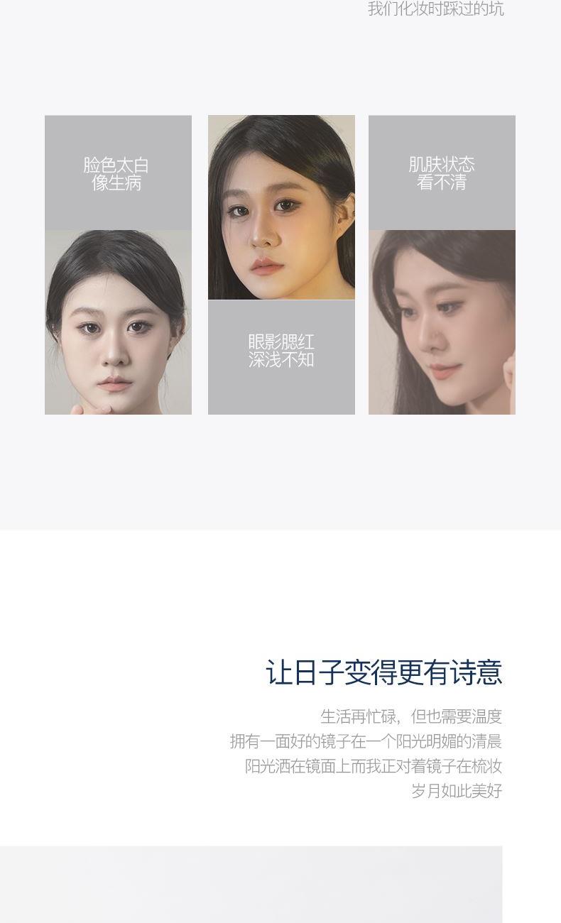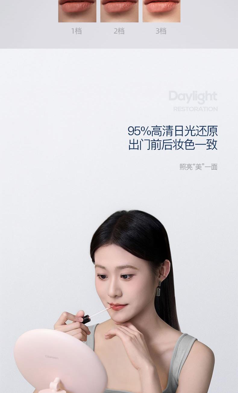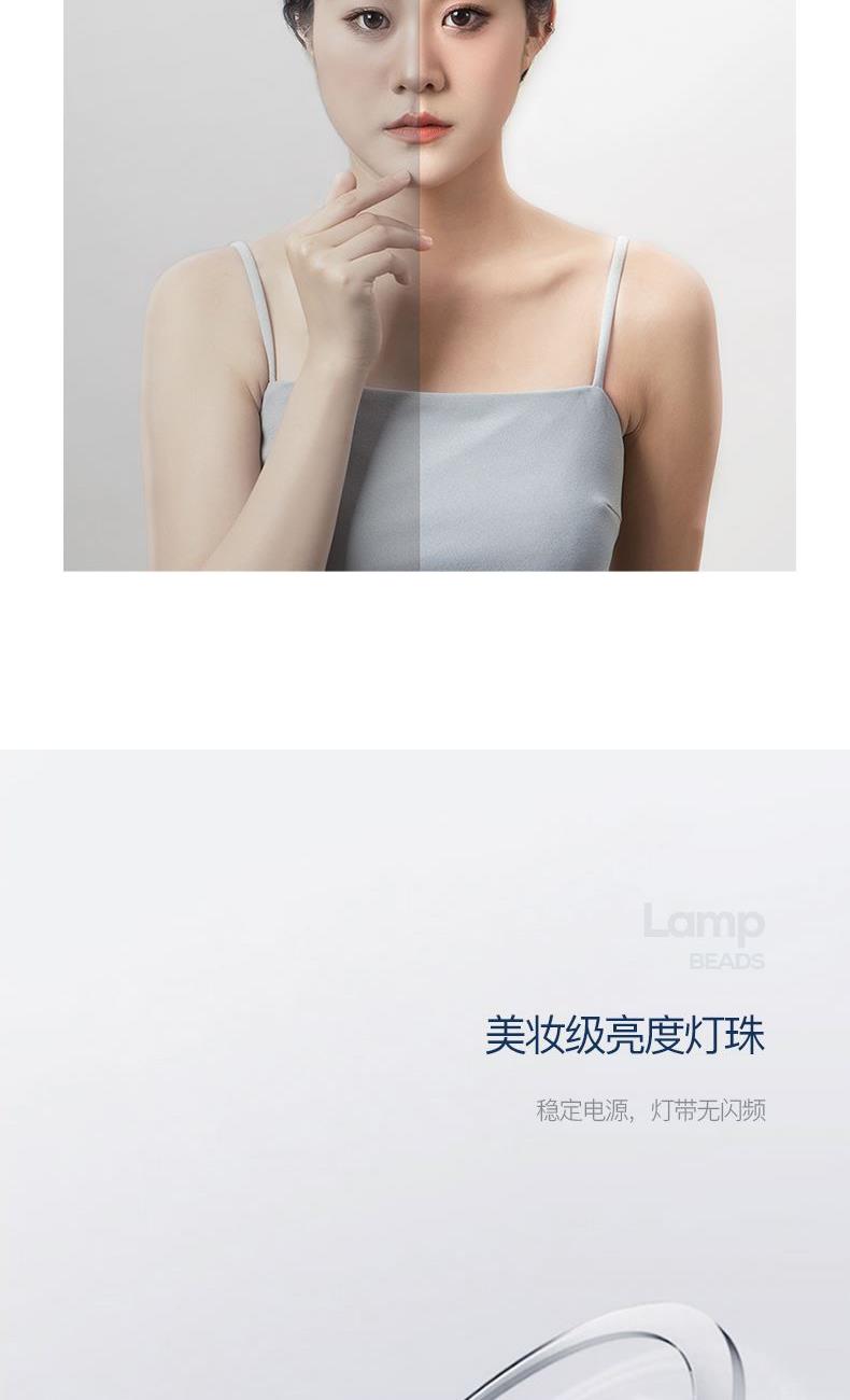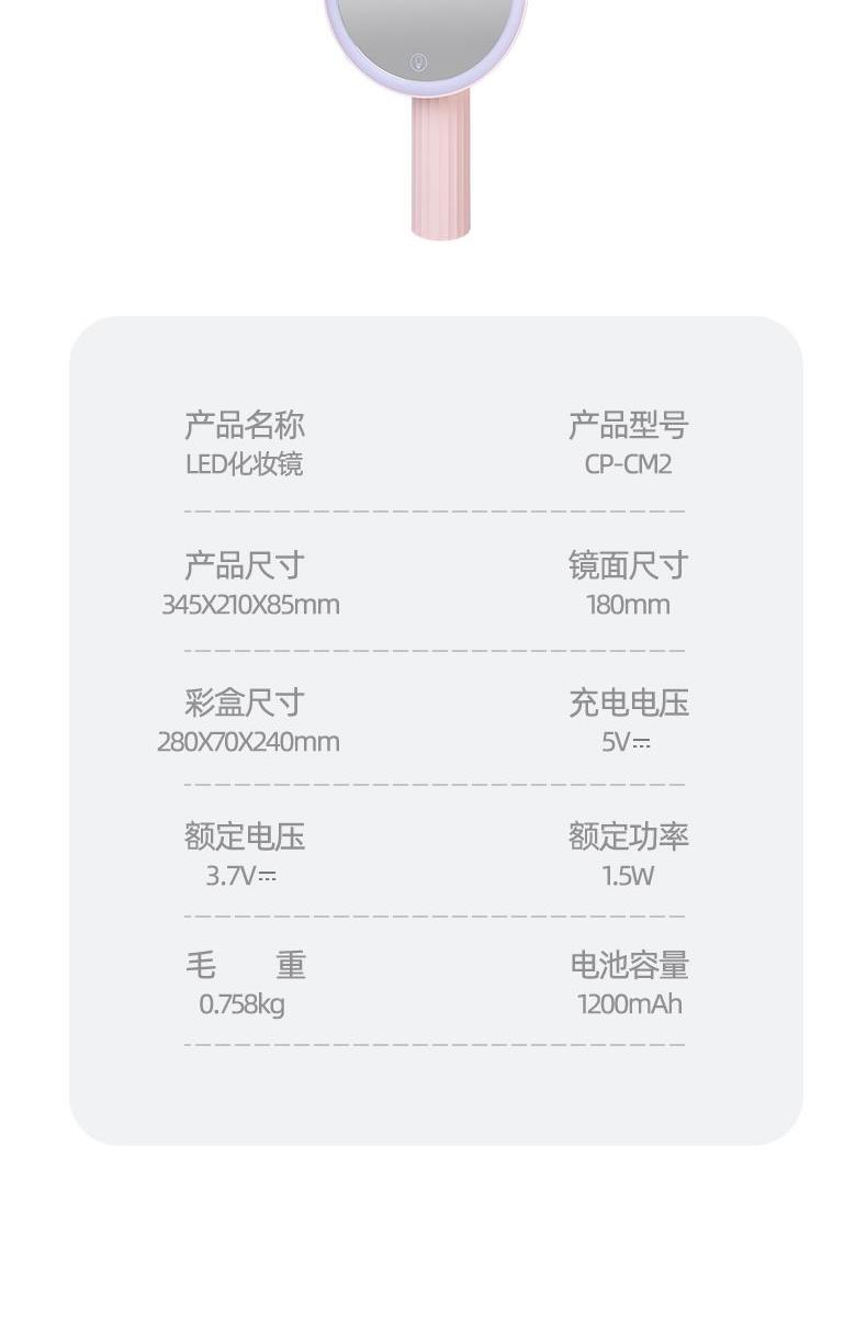 產(chǎn)品參數(shù): 產(chǎn)品型號(hào):CP-CM2 額定電壓:3.7V? 充電電壓:5V? 額定功率:1.5W 電池容量:1200mAh 商品條碼 : 6972831860860 產(chǎn)品尺寸 : 345X210X85mm 包裝尺寸:280X70X240mm 產(chǎn)品毛重 : 758g 核心賣點(diǎn): 1、3個(gè)檔位調(diào)節(jié),觸控光屏,一鍵調(diào)節(jié) 2、95%高清日光還原,出門前后妝色一致 3、美妝級(jí)亮度燈珠,穩(wěn)定電源,燈帶無閃頻 4、4K高清體驗(yàn),精選高清鍍銀鏡面,無色偏,無變形 5、可調(diào)節(jié)鏡面,270°可旋轉(zhuǎn),多角度靈活上妝,滿足你的不同需求 6、180MM大鏡面,無線長續(xù)航