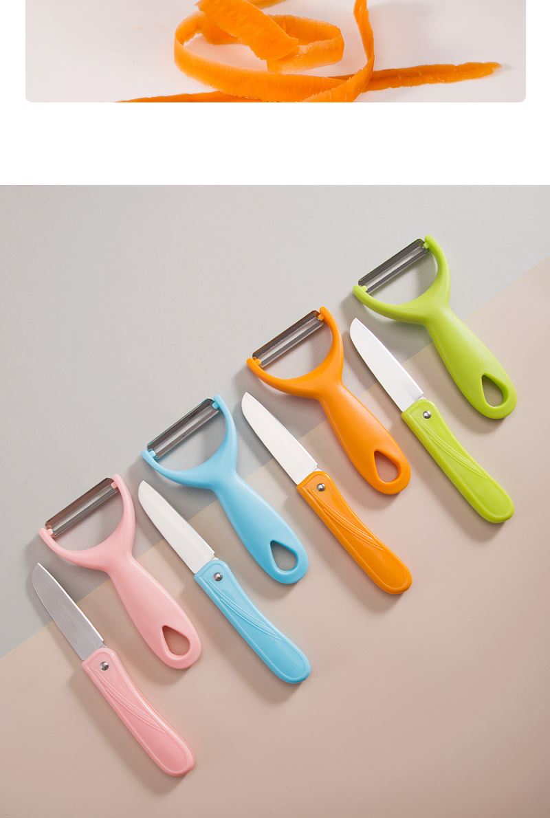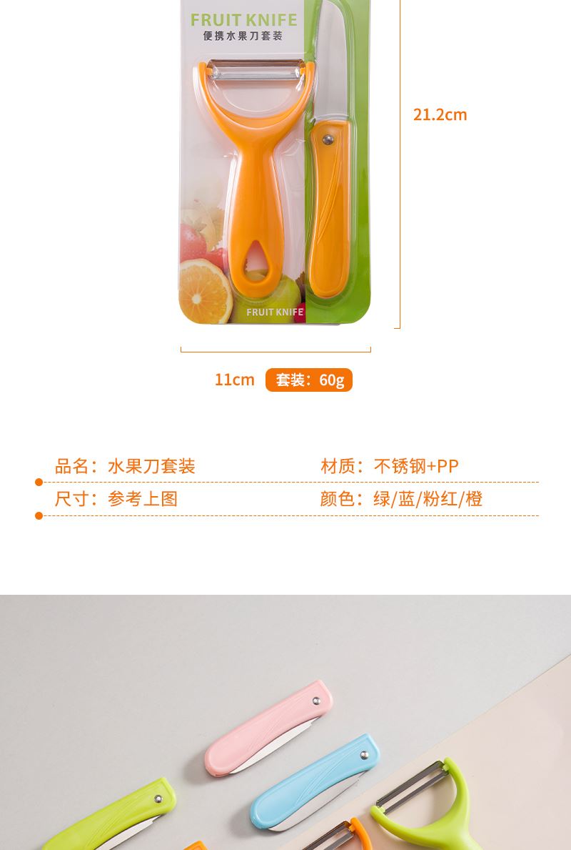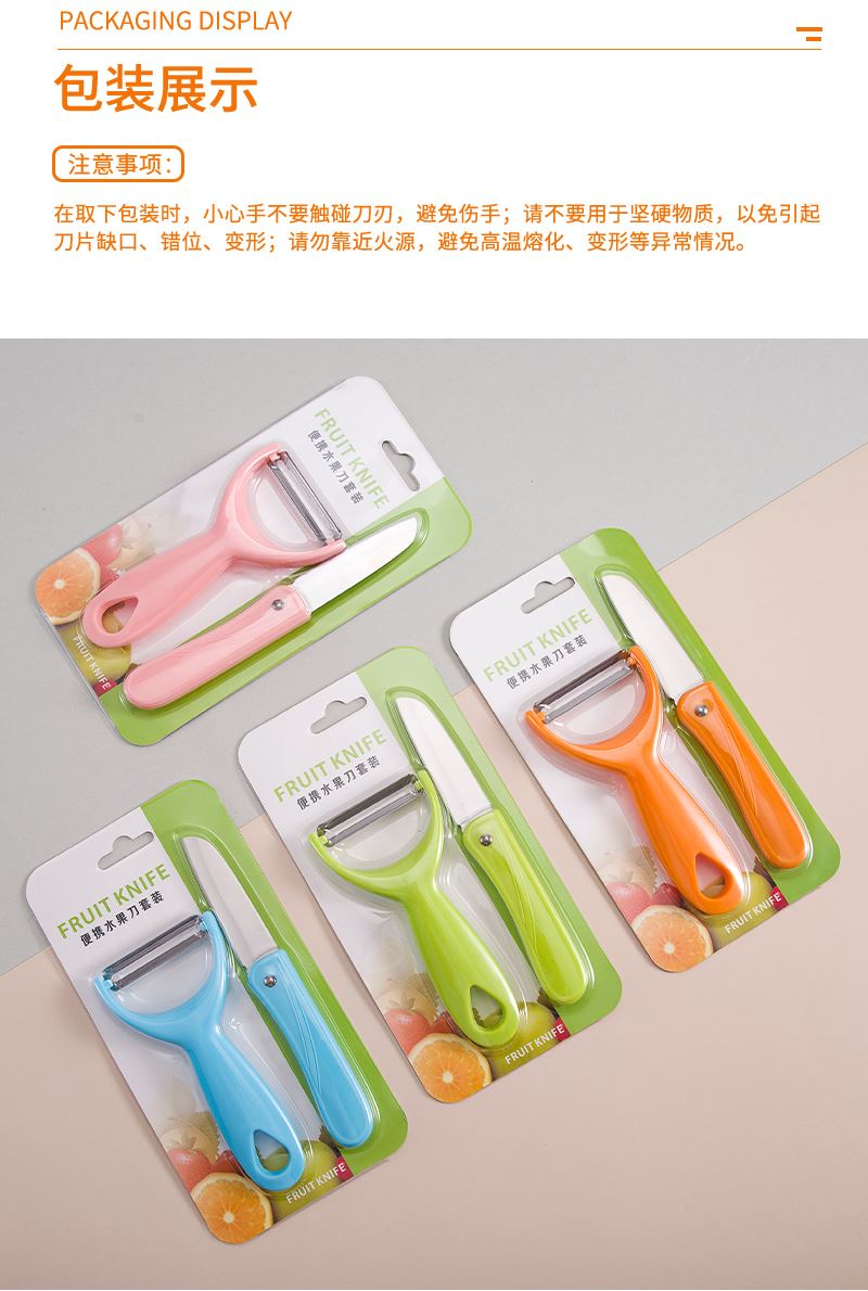 產(chǎn)品組合:水果刀 瓜刨 產(chǎn)品規(guī)格: 水果刀:17.5 削皮器:14.5*5.2cmm 材 質(zhì):PP 陶瓷 包 裝:吸卡 重量/套: 62g