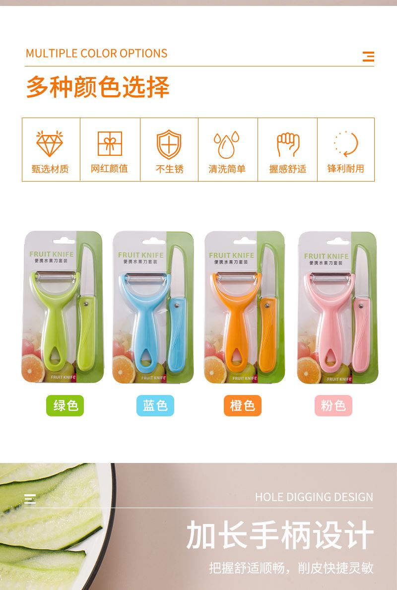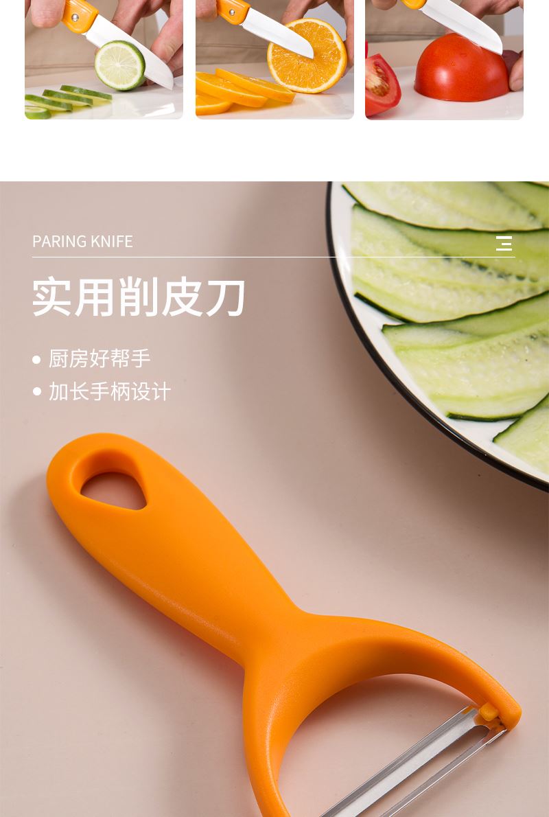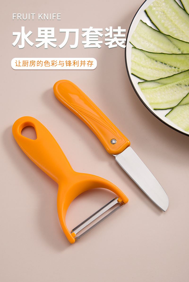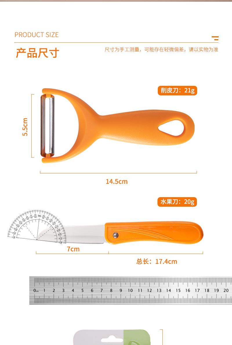 產(chǎn)品組合:水果刀 瓜刨 產(chǎn)品規(guī)格: 水果刀:17.5 削皮器:14.5*5.2cmm 材 質(zhì):PP 陶瓷 包 裝:吸卡 重量/套: 62g