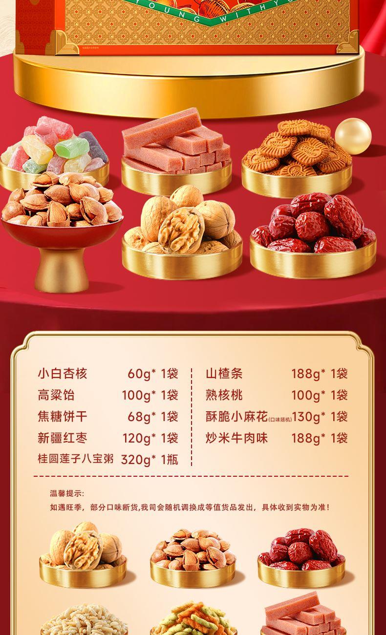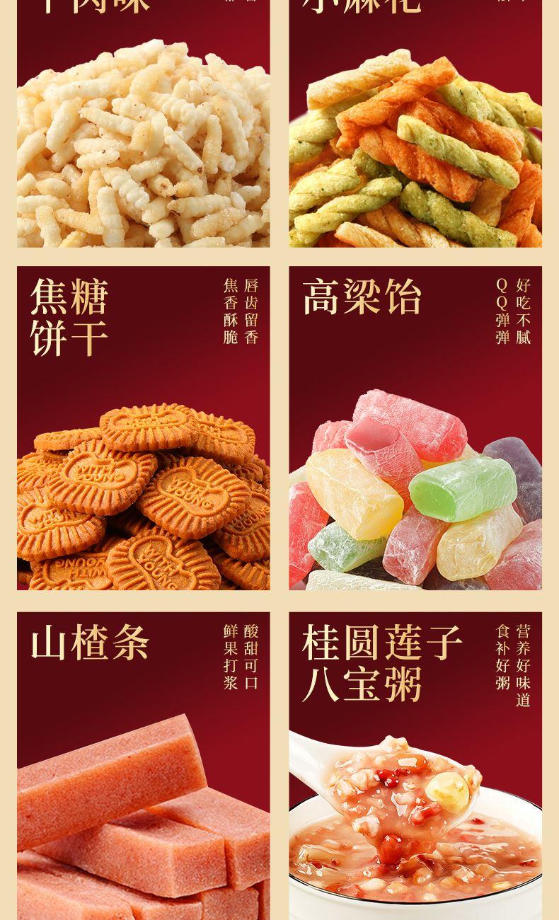 熟核桃100g 小白杏60g 紅棗120g 山楂條188g 小麻花130g(牛肉) 八寶粥320g 焦糖餅干68g 高粱飴100g 炒米牛肉味188g