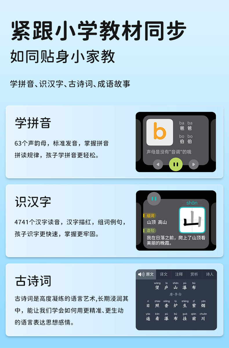 11、發(fā)音,學(xué)拼音、識(shí)漢字,古詩(shī)詞、成語(yǔ)故事,提升文化底蘊(yùn),開啟孩子早期啟蒙教育