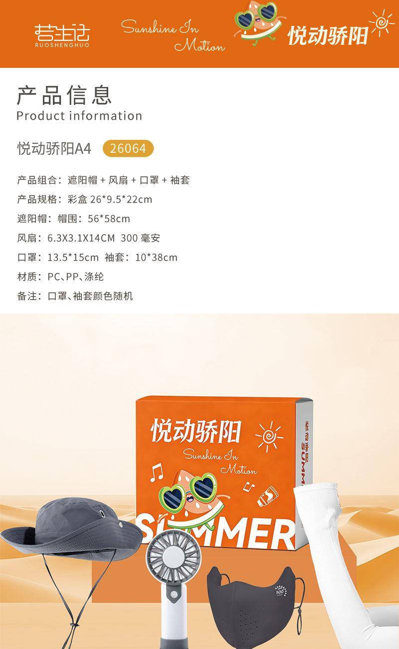 產(chǎn)品組合:遮陽(yáng)帽+風(fēng)扇+口罩+袖套 遮陽(yáng)帽:帽圍:56*58cm 風(fēng)扇:6.3X3.1X14CM 300毫安 口罩:13.5*15cm 袖套: 10*38cm 材質(zhì):PC、PP、滌綸 包裝:彩盒 備注:口罩、袖套顏色隨機(jī)