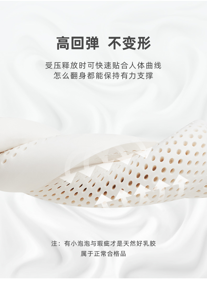 1.乳膠是一種天然材質(zhì),其原液是直接從橡膠樹皮中滴落下來的乳膠汁物理發(fā)泡加工一次成型,有天然乳香氣息,含量高達90%以上乳膠成分,多緯蜂窩狀氣孔,較其他枕芯更為舒適,快速散發(fā)人體睡眠中余熱和濕氣。