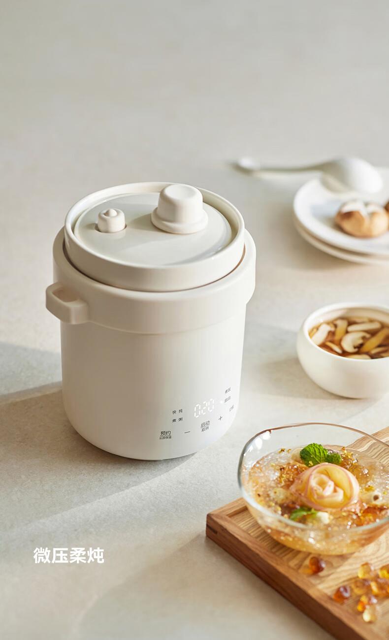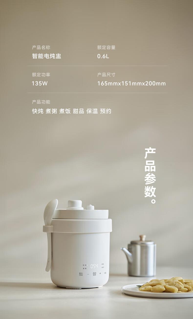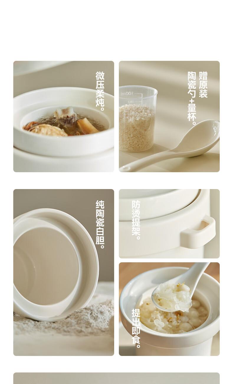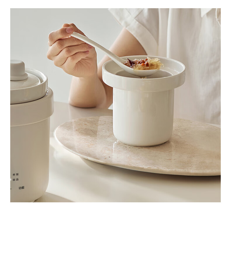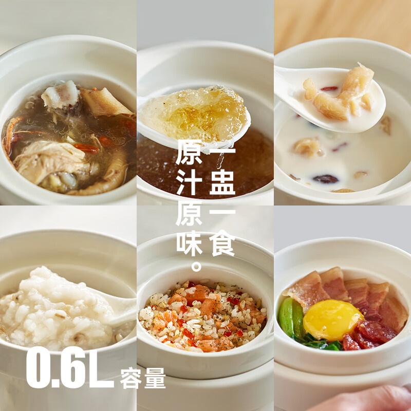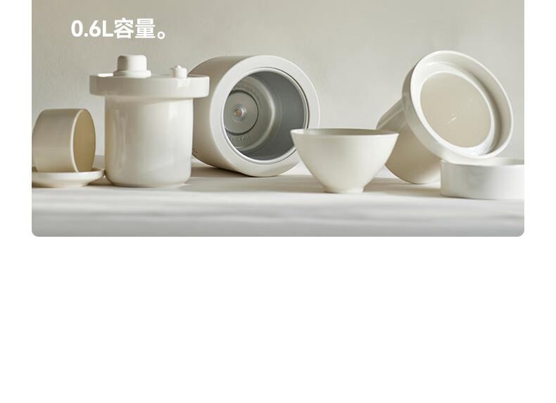 顏色:陶白色 容量:0.6L 毛重:1.6kg 額定功率:135W 產(chǎn)品尺寸:165*151*200mm 包裝尺寸:209*194*260mm 條碼 : 6977735712970 1. 增加了微壓技術(shù)的電燉鍋 2. 快速軟爛,營養(yǎng)不流失 3. 智能程序,預(yù)約定時,滿足多樣化制作