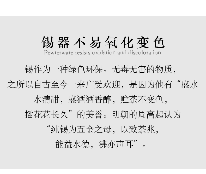 ? 錫質(zhì)恒久:錫材打造,溫潤光澤,經(jīng)久耐用不氧化,歷經(jīng)歲月仍熠熠生輝。
