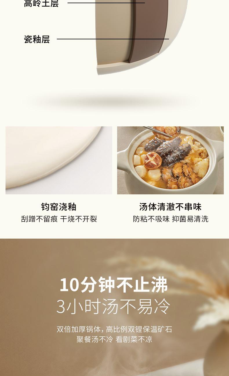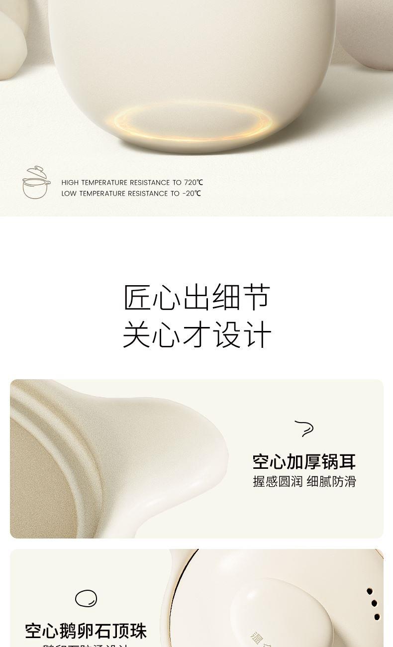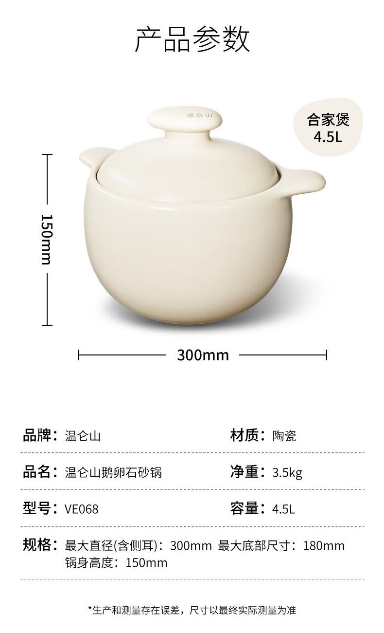 【型號(hào)】VE068 【SKU】VE068-4.5LPk01 【材質(zhì)】陶瓷 【規(guī)格】4.5L 【凈重】3.5kg 【毛重】4.2kg 【包裝方式】郵購(gòu)盒 【包裝尺寸】330*330*270mm 【顏色】白境玫瑰 【條碼】6972547375474 坯厚釉實(shí),古法澆釉工藝; 聚熱保溫,雙倍加厚鍋體; 導(dǎo)熱均勻,冷熱不開(kāi)裂; 鍋身細(xì)膩,鍋耳握感圓潤(rùn)。
