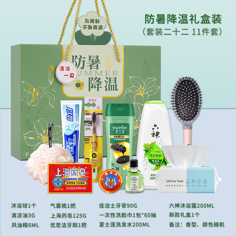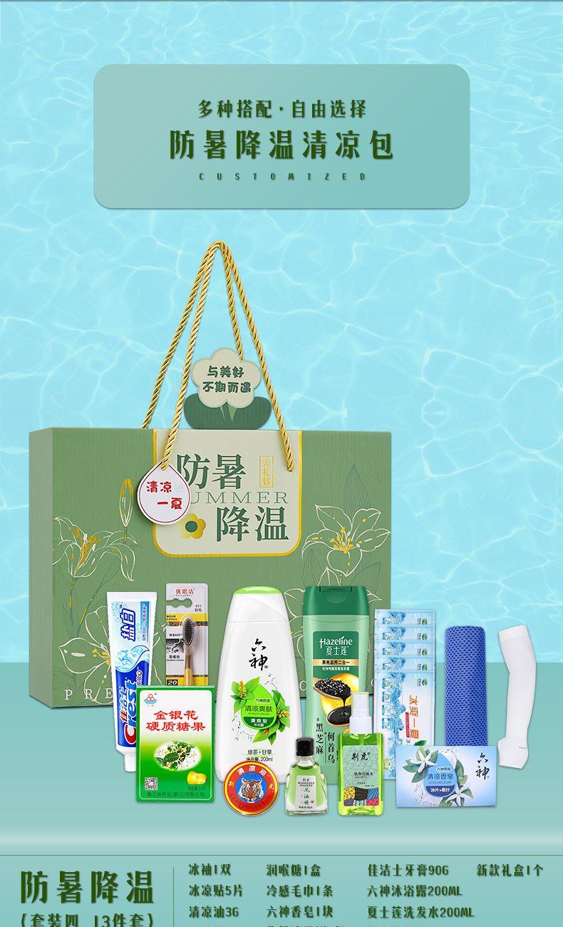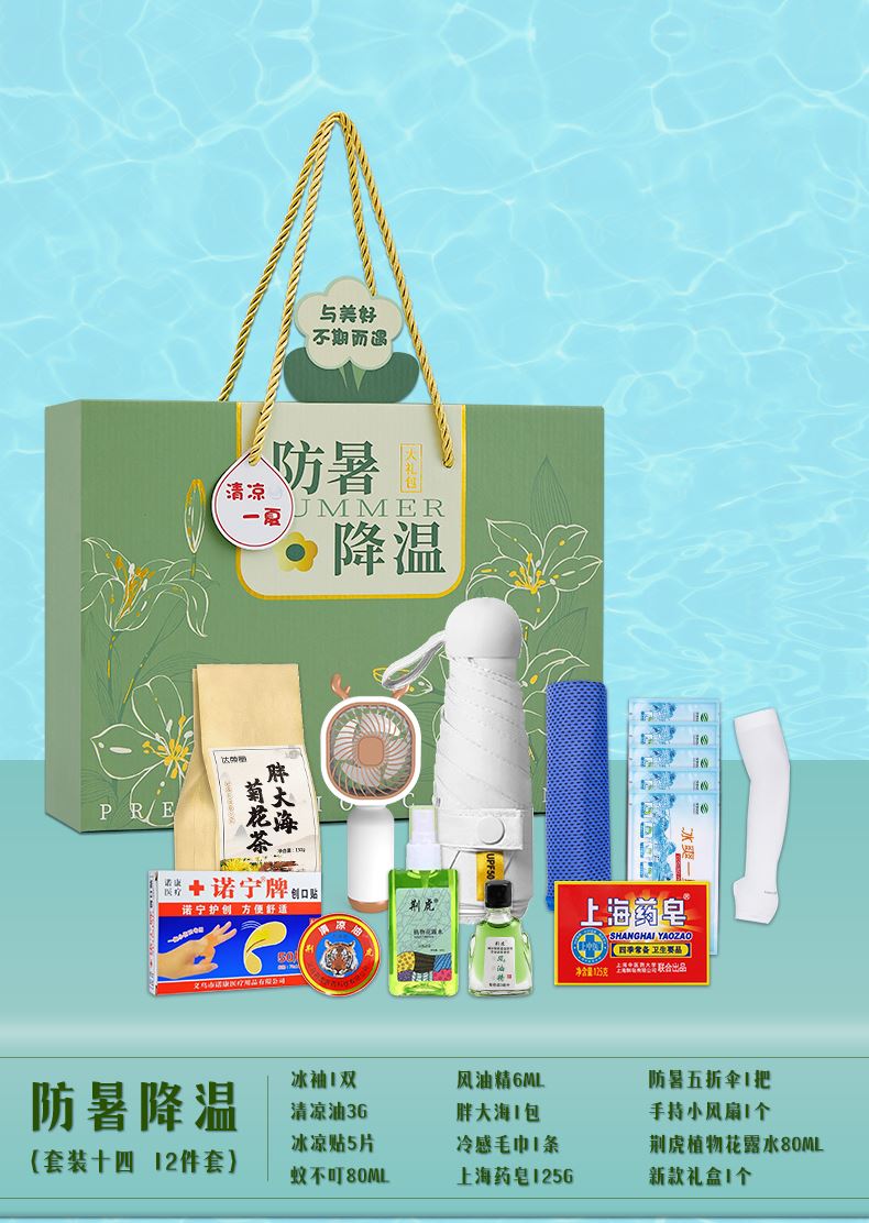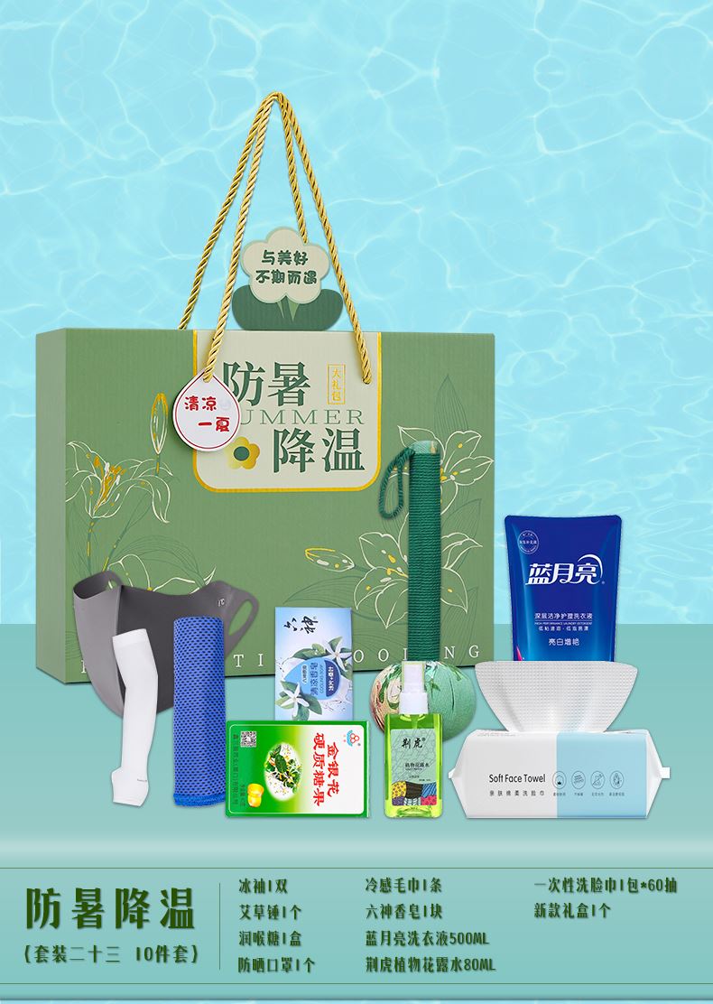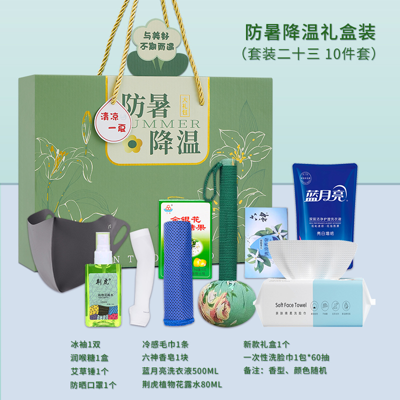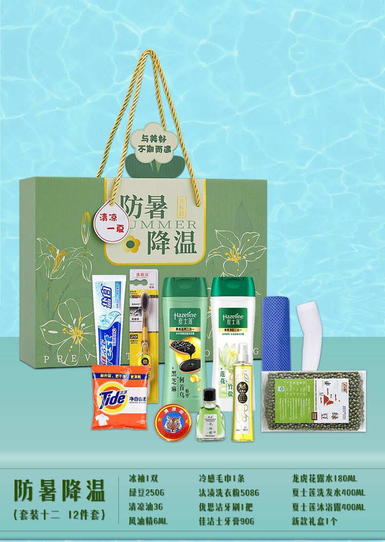 3.首圖款式產(chǎn)品明細(xì):防暑降溫禮盒裝(套裝二十 10件套):冰涼貼5片,綠豆250ML,冷感毛巾1條,新款禮盒1個(gè),荊虎植物花露水80ML,清涼油3G,優(yōu)思潔牙刷1把,潤(rùn)喉糖1盒,風(fēng)油精6ML,佳潔士牙膏90G