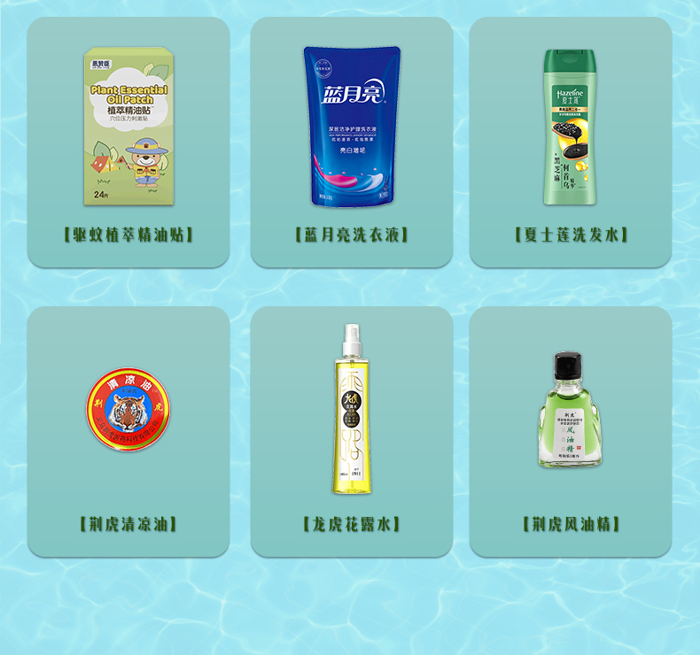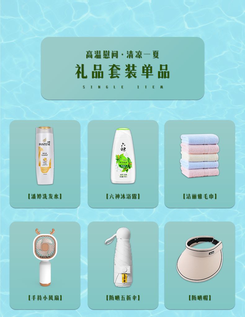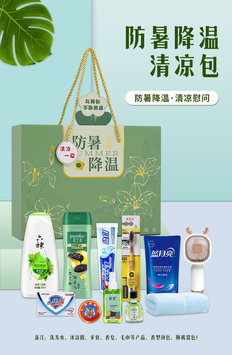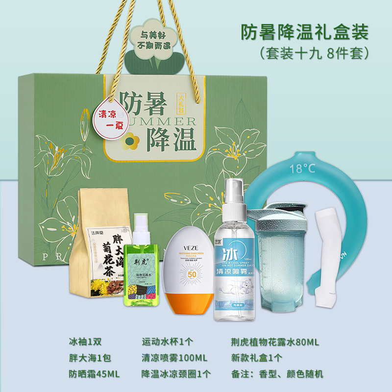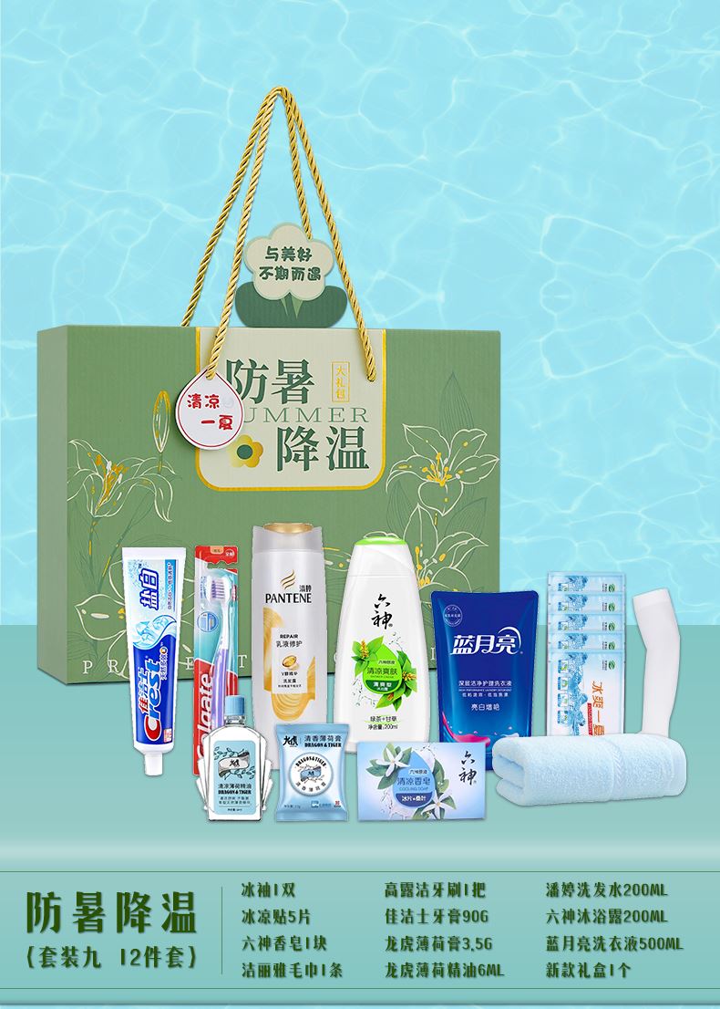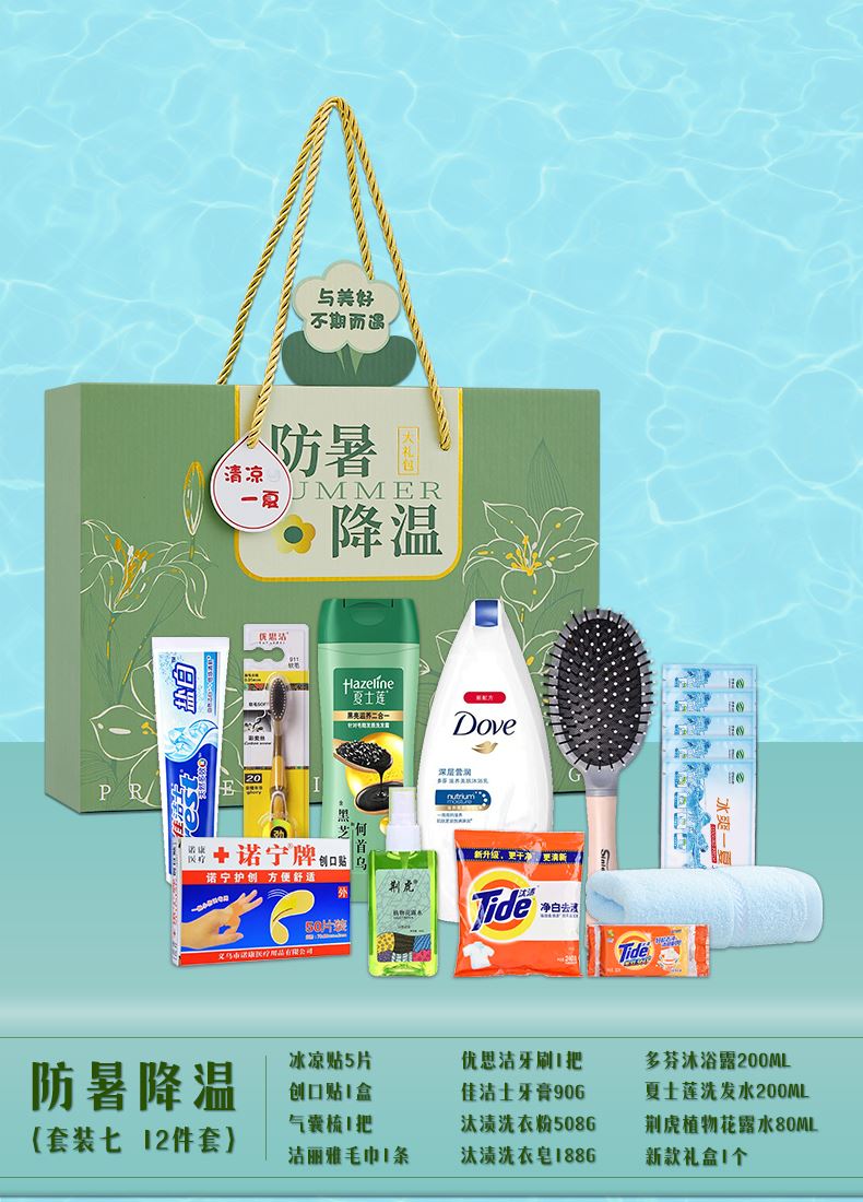 3.首圖款式產(chǎn)品明細(xì):防暑降溫禮盒裝(套裝二十 10件套):冰涼貼5片,綠豆250ML,冷感毛巾1條,新款禮盒1個(gè),荊虎植物花露水80ML,清涼油3G,優(yōu)思潔牙刷1把,潤(rùn)喉糖1盒,風(fēng)油精6ML,佳潔士牙膏90G