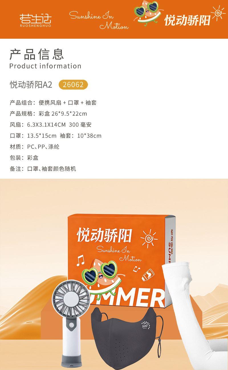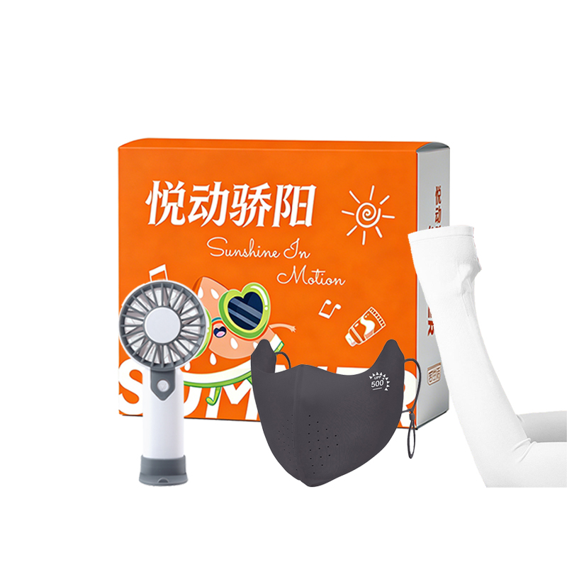 產(chǎn)品組合:便攜風扇+口罩+袖套 風扇:6.3X3.1X14CM 300毫安 口罩:13.5*15cm 袖套: 10*38cm 材質(zhì):PC、PP、滌綸 包裝:彩盒 備注:口罩、袖套顏色隨機