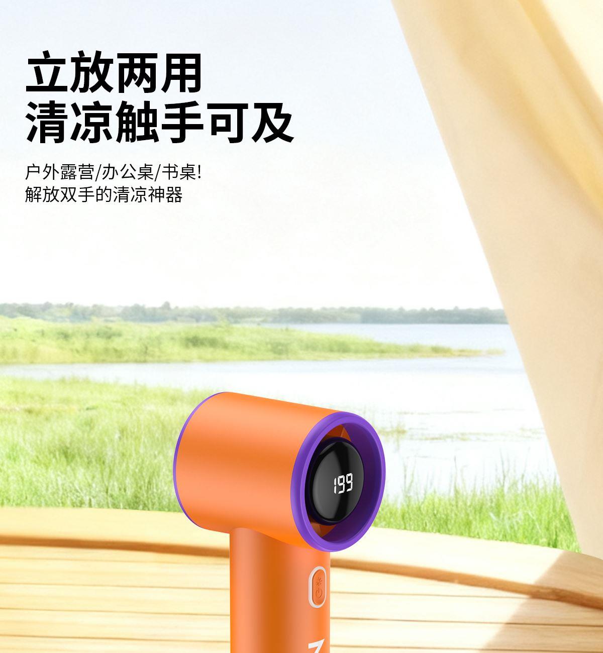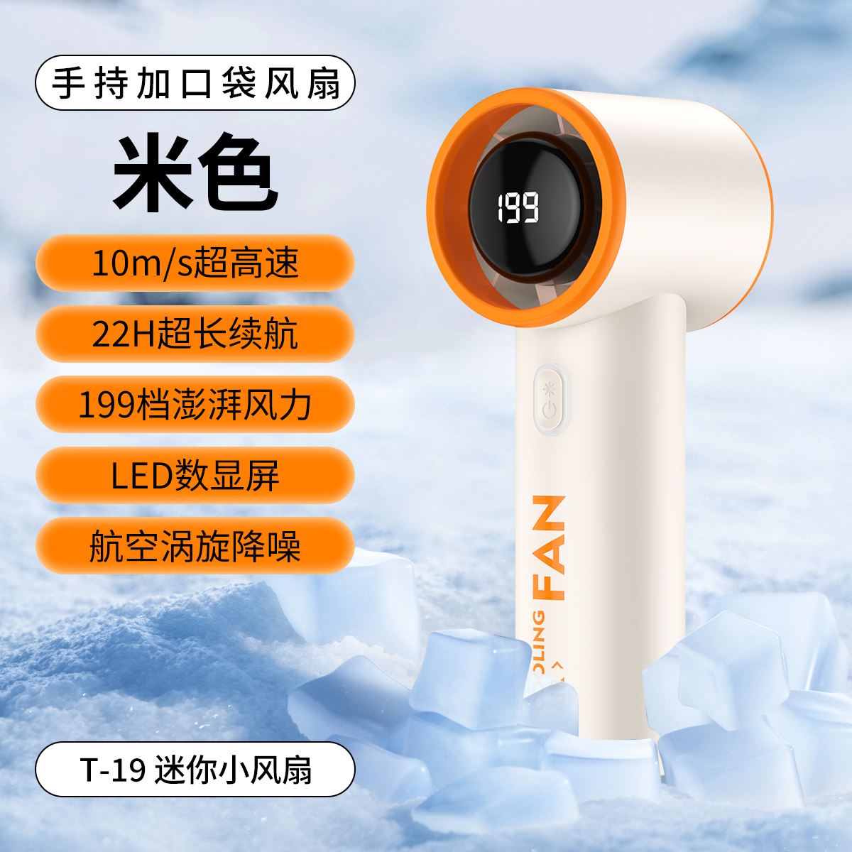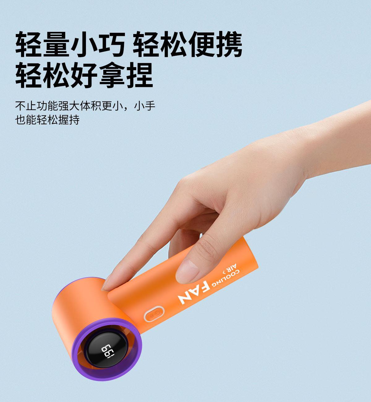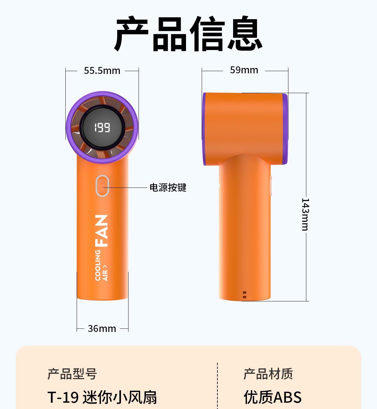 199檔高速手持小風扇T19 顏色:米色 橙色 灰色 整箱數(shù)量:100PCS 外箱:50*24*25.5CM 單個重量:145g 彩盒尺寸:178*66*68mm 整箱重量:18kg 尺寸:158*61*43mm 材質:ABS材質 容量:1800mAh 包裝:彩盒包裝 【推薦理由】: 迷你精致小巧,方便攜帶高速風扇 5檔數(shù)顯可調節(jié)高速風扇 桌面/手持/戶外多種使用方法 2000毫安大容量電池待機更長