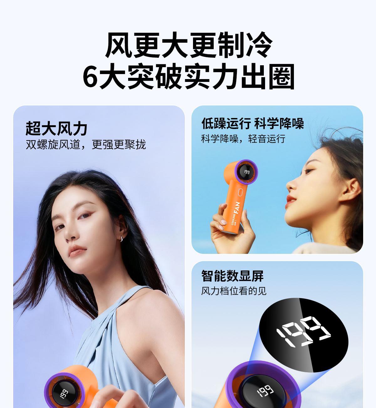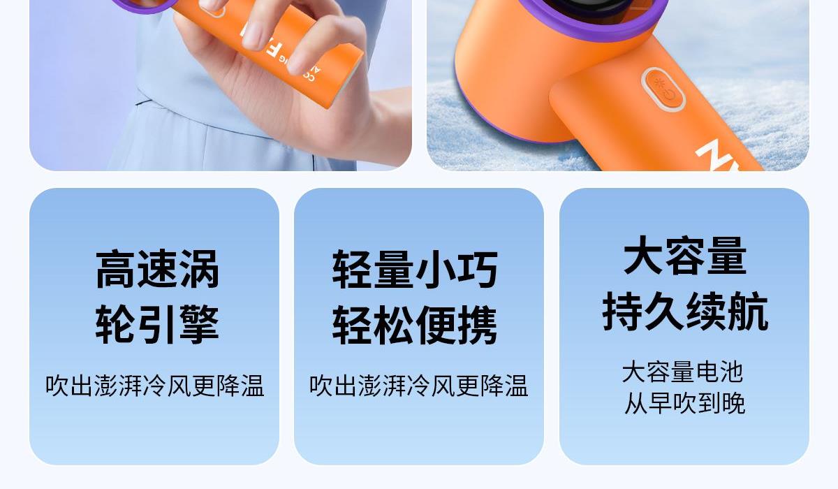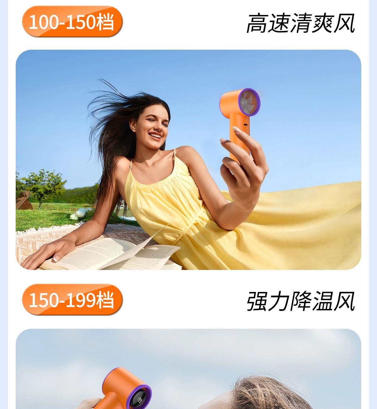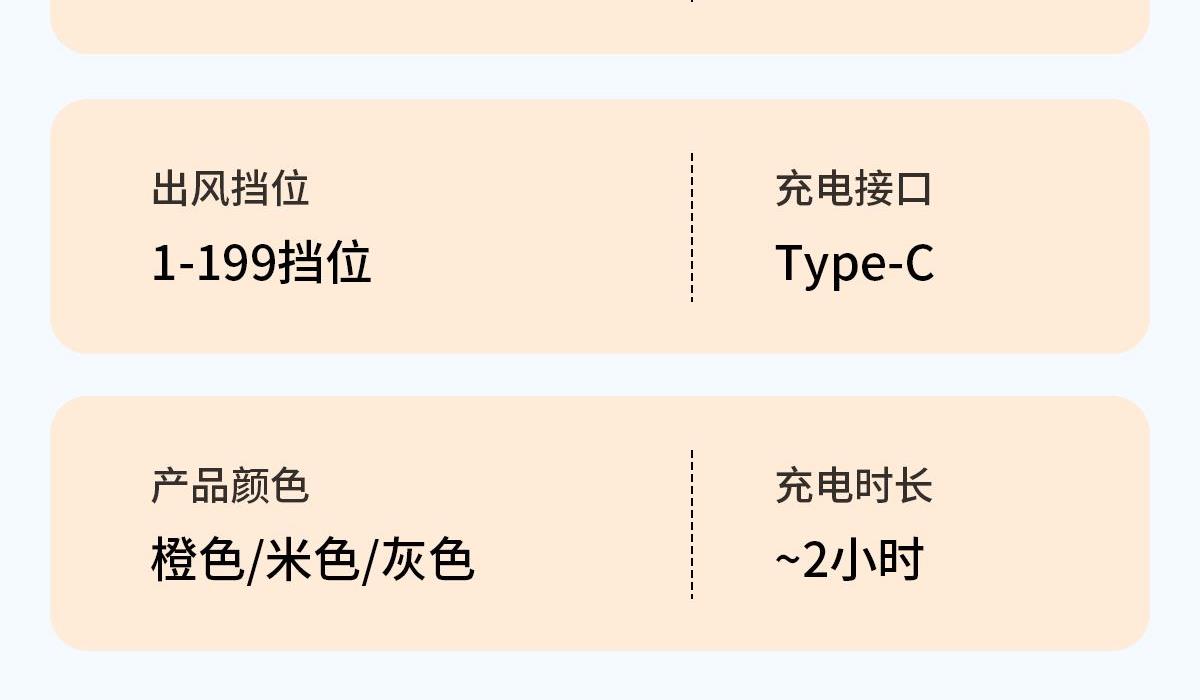 199檔高速手持小風扇T19 顏色:米色 橙色 灰色 整箱數(shù)量:100PCS 外箱:50*24*25.5CM 單個重量:145g 彩盒尺寸:178*66*68mm 整箱重量:18kg 尺寸:158*61*43mm 材質:ABS材質 容量:1800mAh 包裝:彩盒包裝 【推薦理由】: 迷你精致小巧,方便攜帶高速風扇 5檔數(shù)顯可調節(jié)高速風扇 桌面/手持/戶外多種使用方法 2000毫安大容量電池待機更長