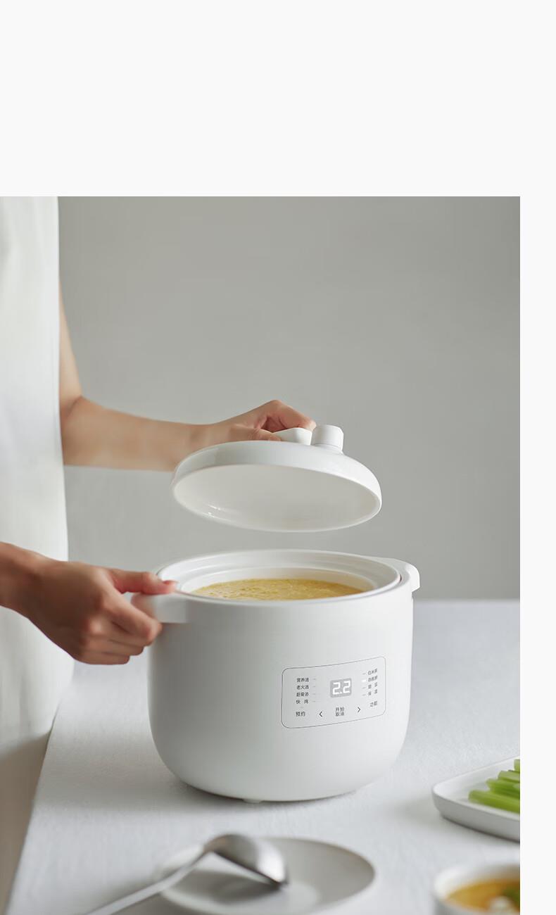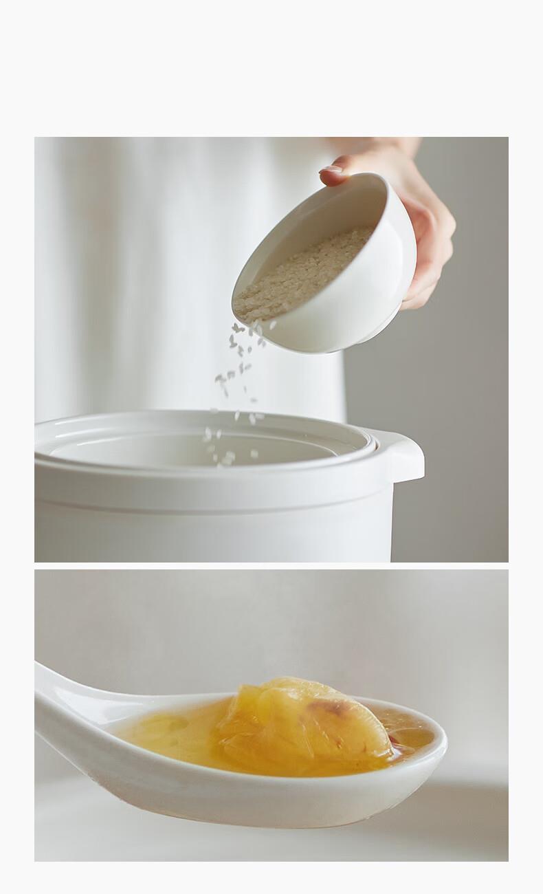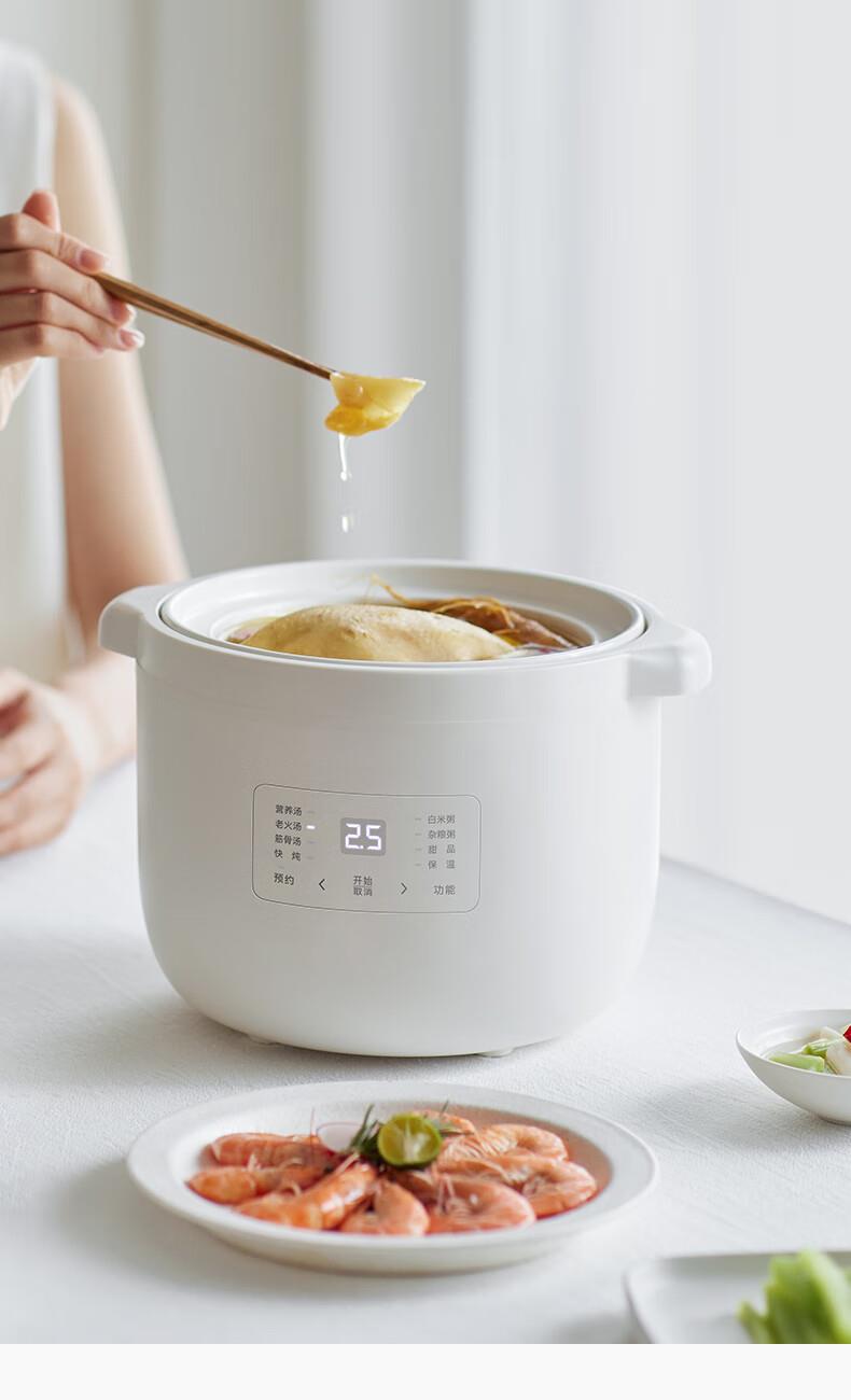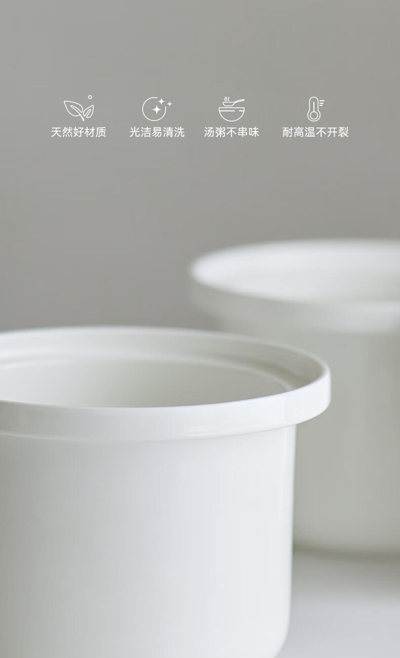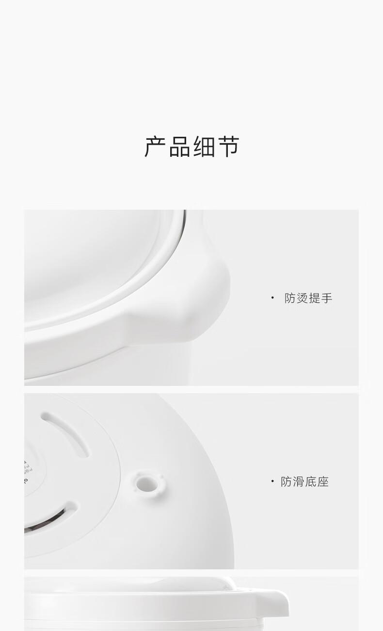 顏色:陶白色 容量:2.5L 功率:250W 產(chǎn)品尺寸:266*227*226mm 包裝尺寸:266*266*271mm 毛重:3.2kg 條碼 : 6977735710525 1. 2.5L超大容量,一次就是一家人的量 2. 加厚白瓷內(nèi)膽,360°全域受熱 3. 冷水快燉,8大功能菜單 4. 升級(jí)微壓,提升燉煮速度 5. 自動(dòng)保溫,9.5h預(yù)約