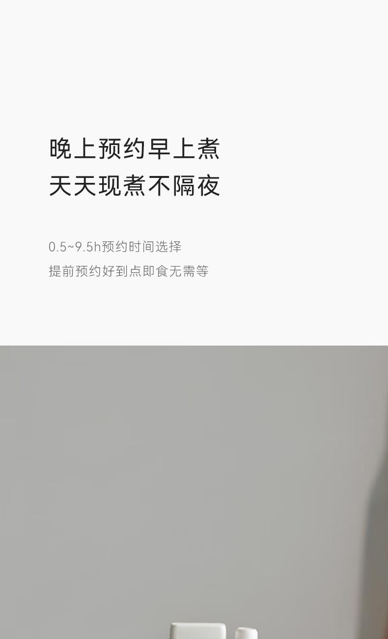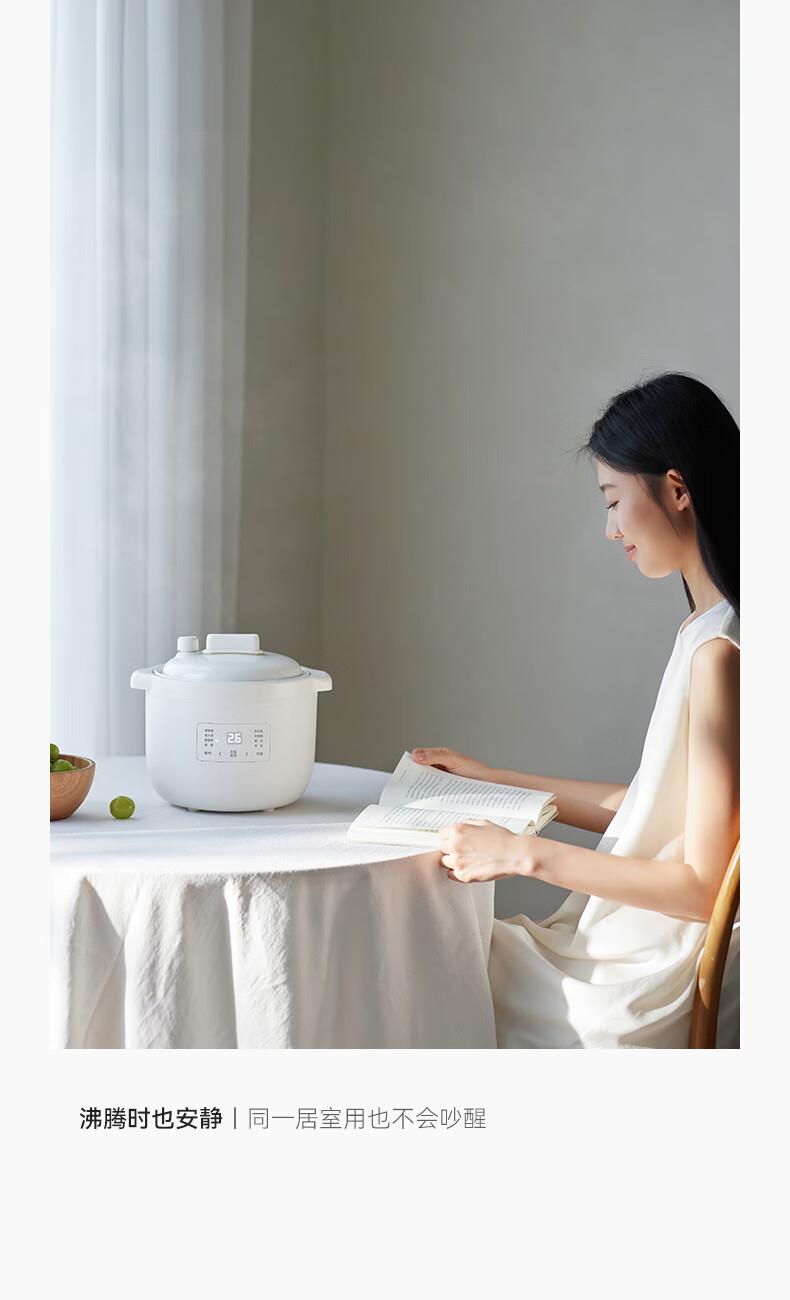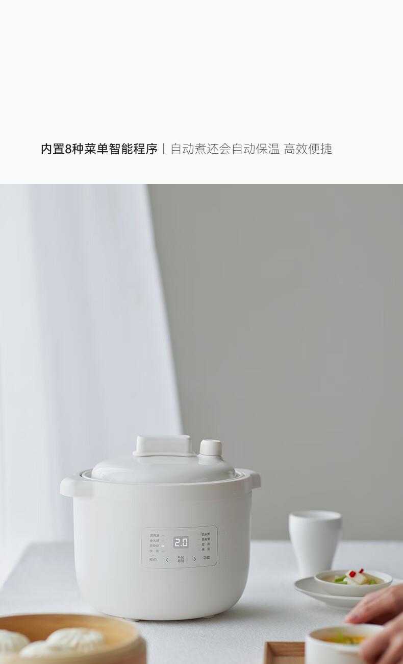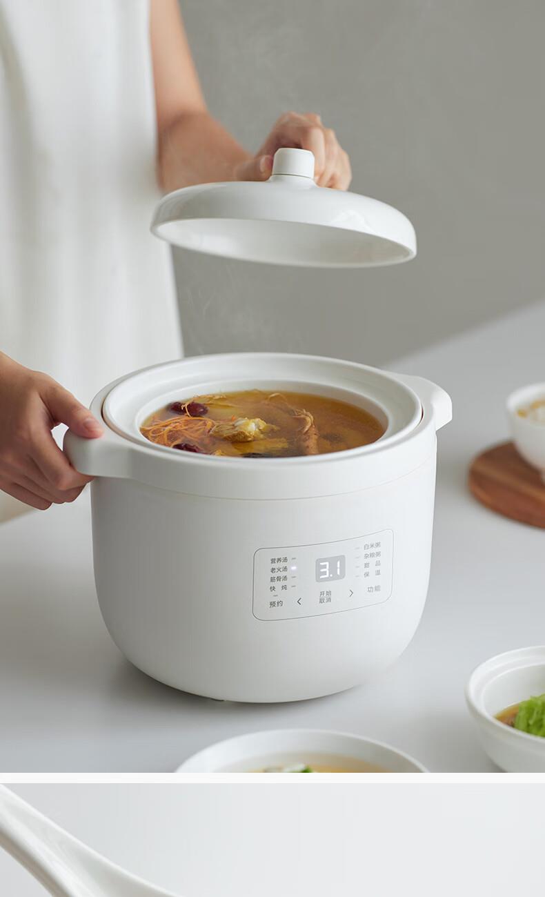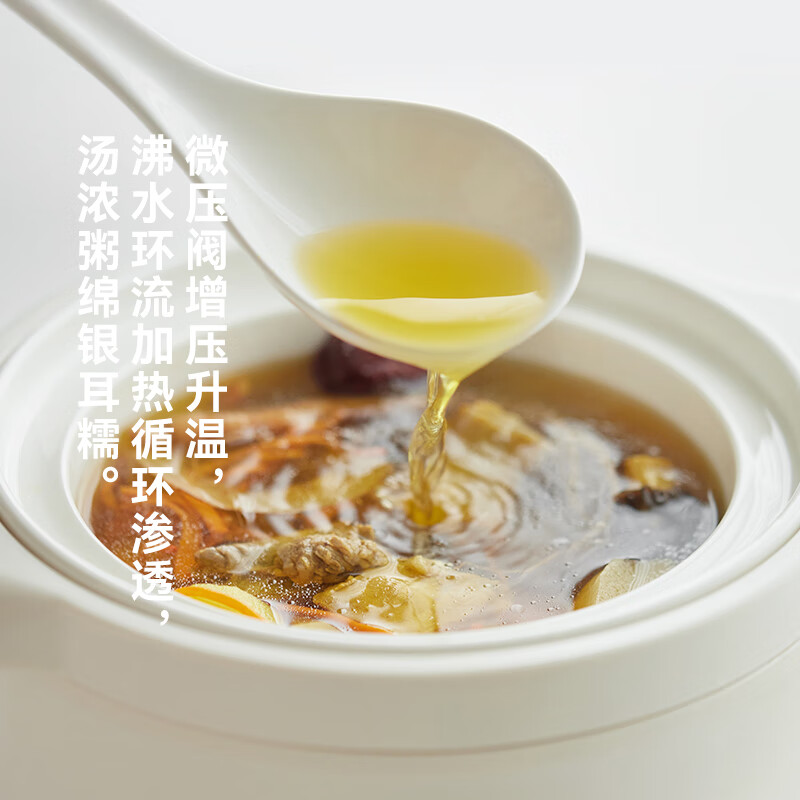 顏色:陶白色 容量:2.5L 功率:250W 產(chǎn)品尺寸:266*227*226mm 包裝尺寸:266*266*271mm 毛重:3.2kg 條碼 : 6977735710525 1. 2.5L超大容量,一次就是一家人的量 2. 加厚白瓷內(nèi)膽,360°全域受熱 3. 冷水快燉,8大功能菜單 4. 升級(jí)微壓,提升燉煮速度 5. 自動(dòng)保溫,9.5h預(yù)約
