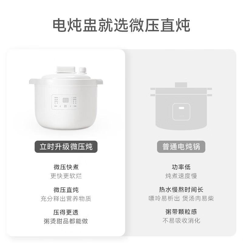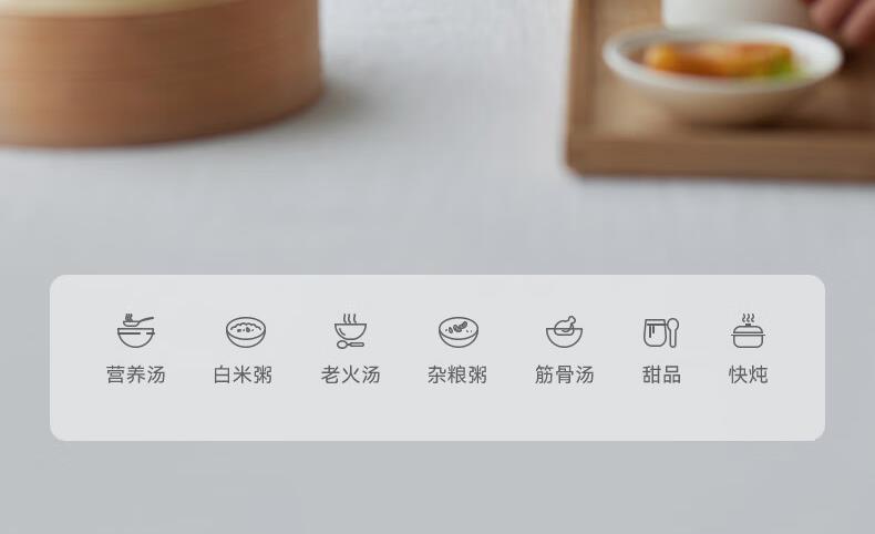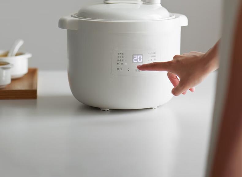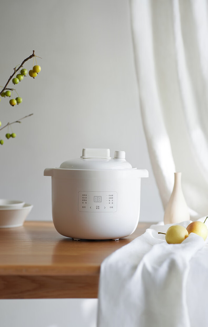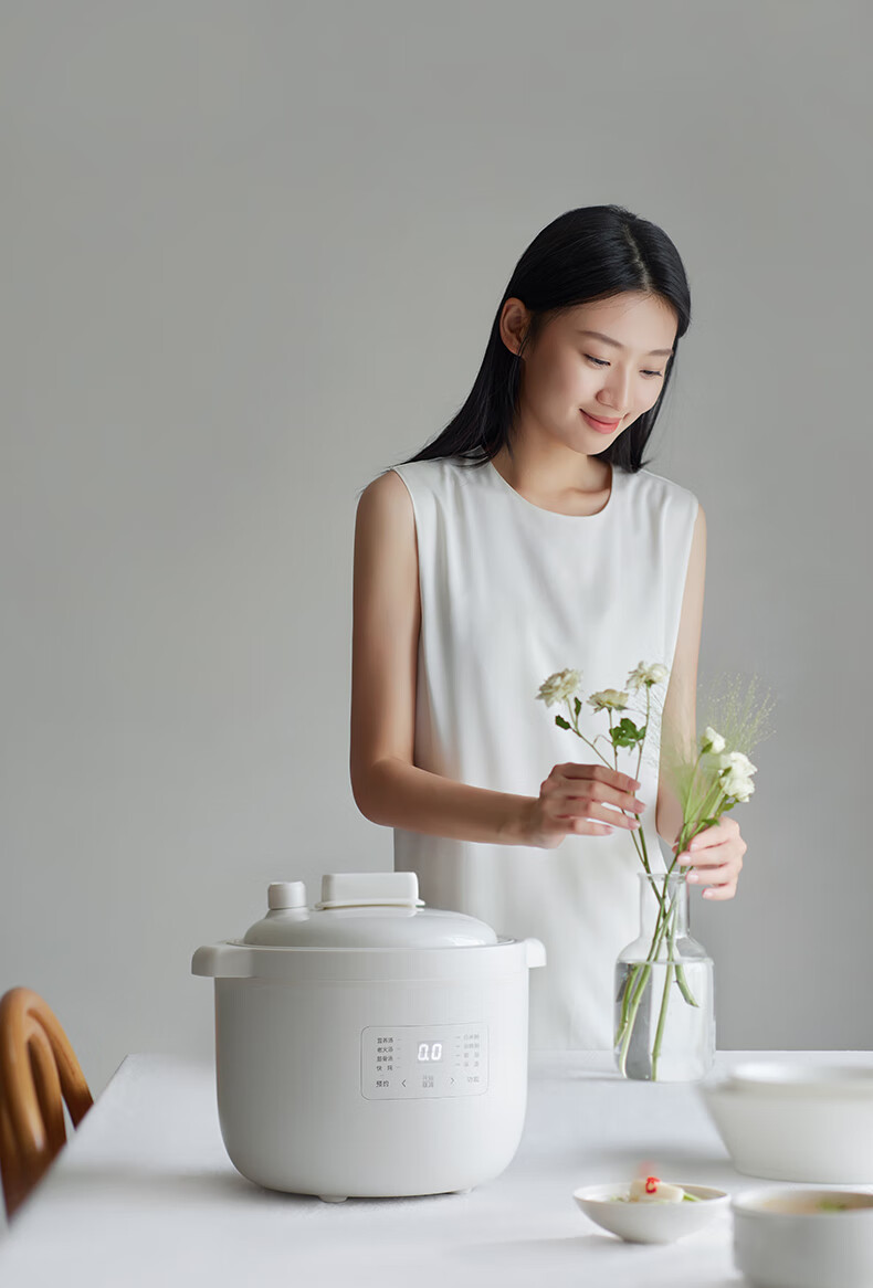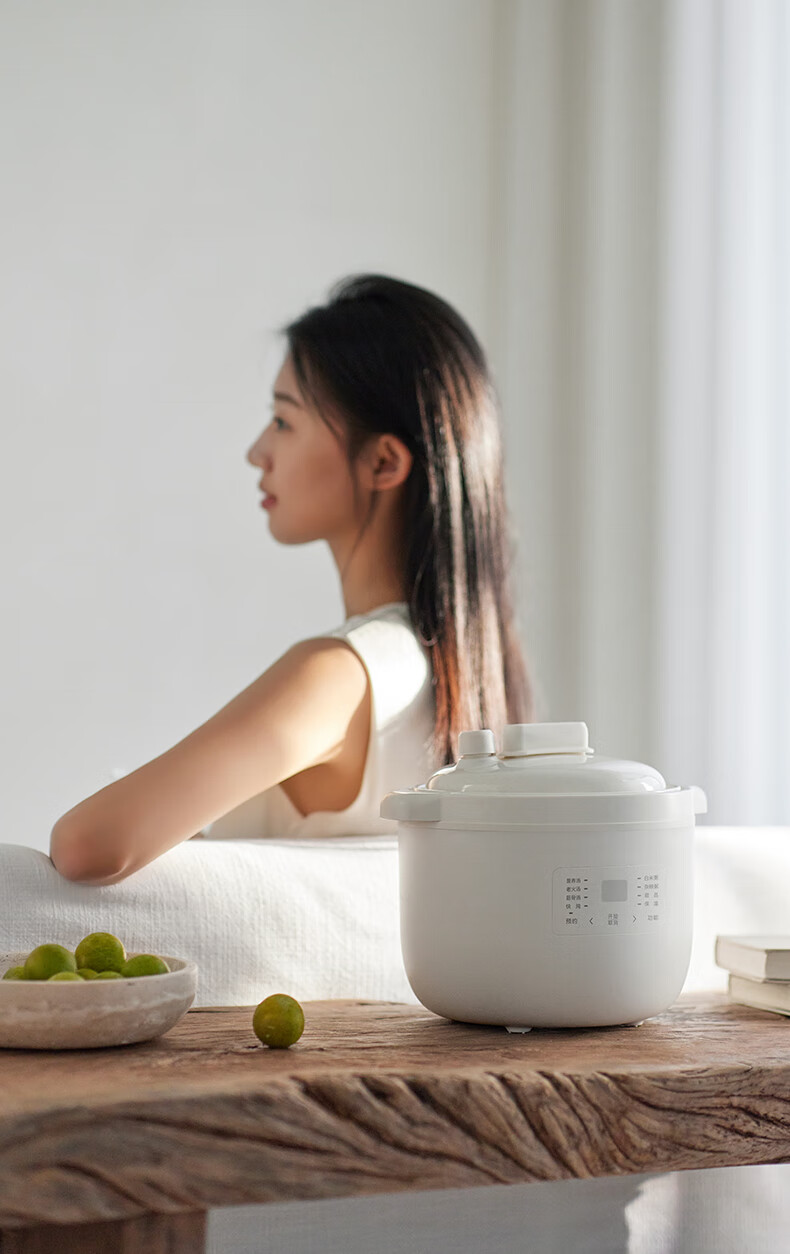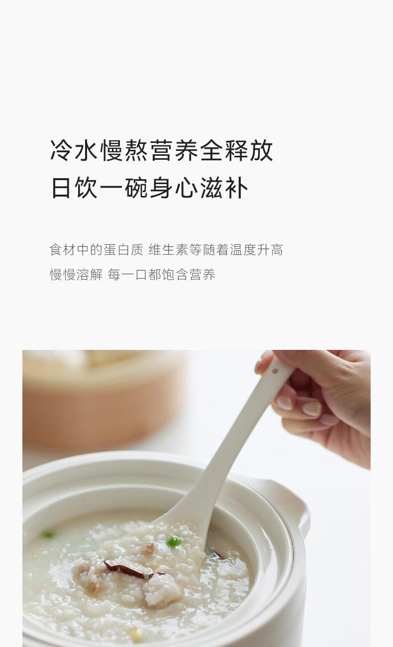 顏色:陶白色 容量:2.5L 功率:250W 產(chǎn)品尺寸:266*227*226mm 包裝尺寸:266*266*271mm 毛重:3.2kg 條碼 : 6977735710525 1. 2.5L超大容量,一次就是一家人的量 2. 加厚白瓷內(nèi)膽,360°全域受熱 3. 冷水快燉,8大功能菜單 4. 升級(jí)微壓,提升燉煮速度 5. 自動(dòng)保溫,9.5h預(yù)約