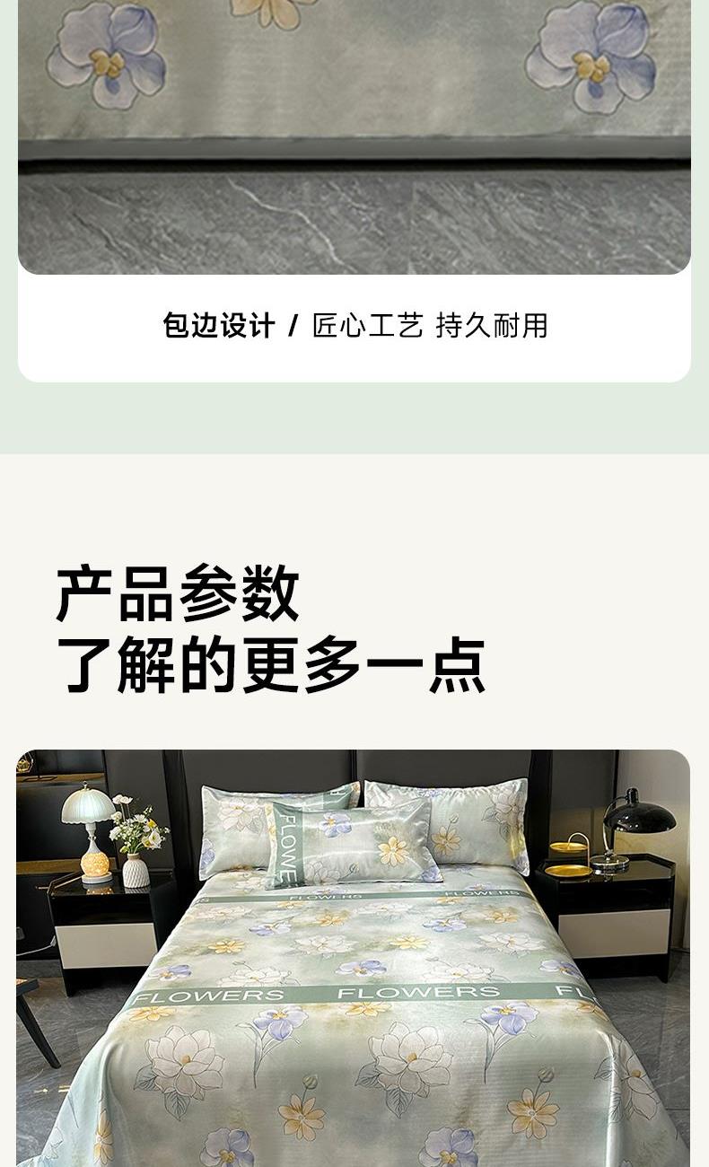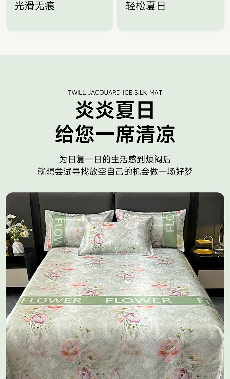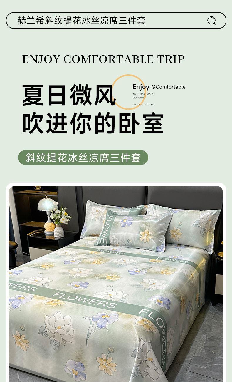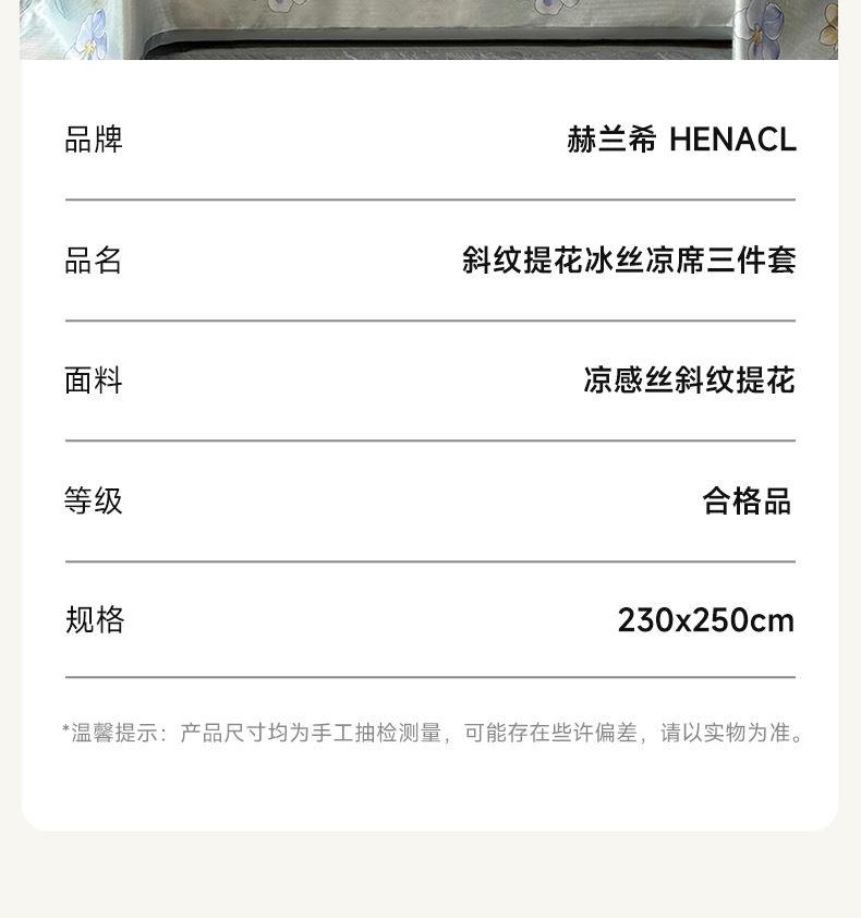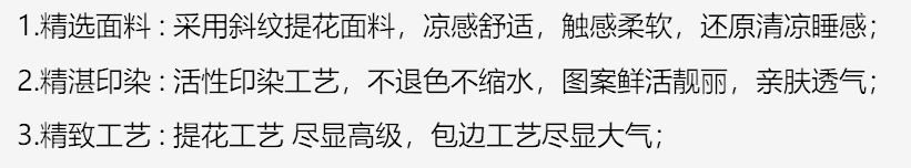 貨 號(hào) :HLX-XZ2513 面 料 :斜紋提花涼感絲 規(guī) 格 :230*250cm 重 量 :凈重約1400g 包裝尺寸 :48*36*13.5cm 裝 箱明細(xì) :8套 /箱或50條/包 1.精選面料 : 采用斜紋提花面料,涼感舒適,觸感柔軟,還原清涼睡感; 2.精湛印染 : 活性印染工藝,不退色不縮水,圖案鮮活靚麗,親膚透氣; 3.精致工藝 : 提花工藝 盡顯高 級(jí),包邊工藝盡顯大氣;