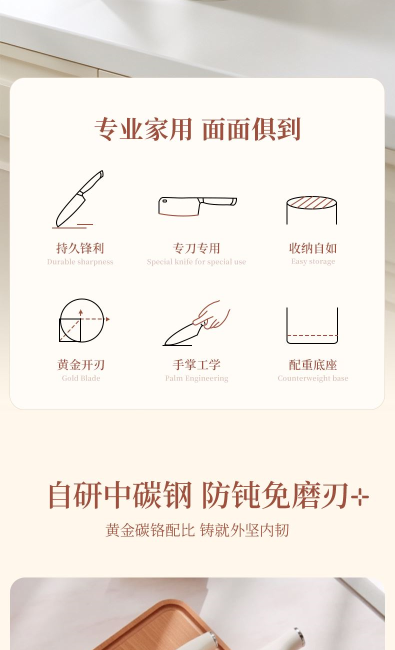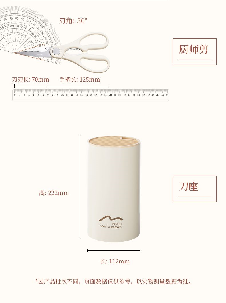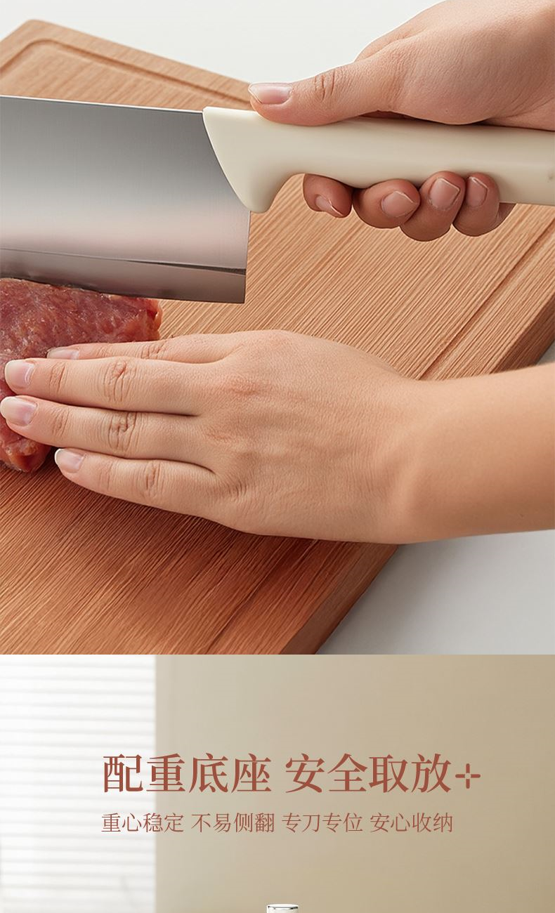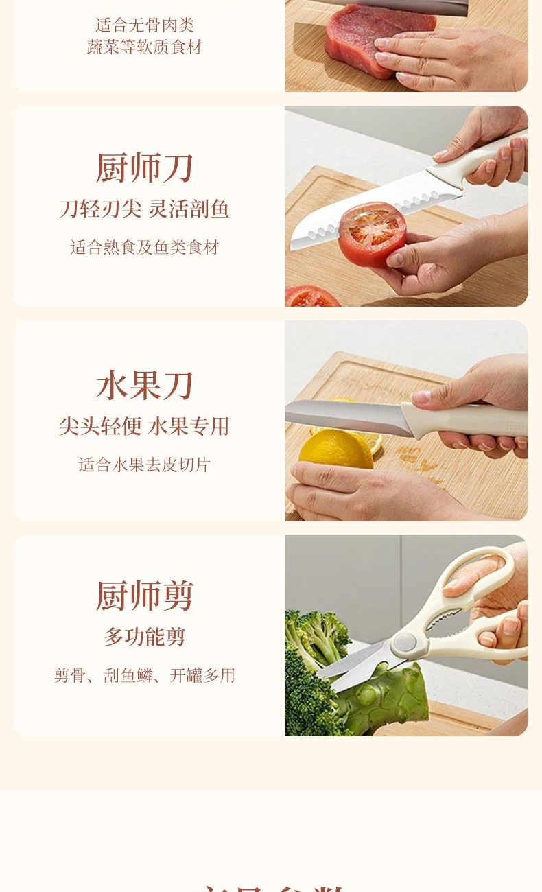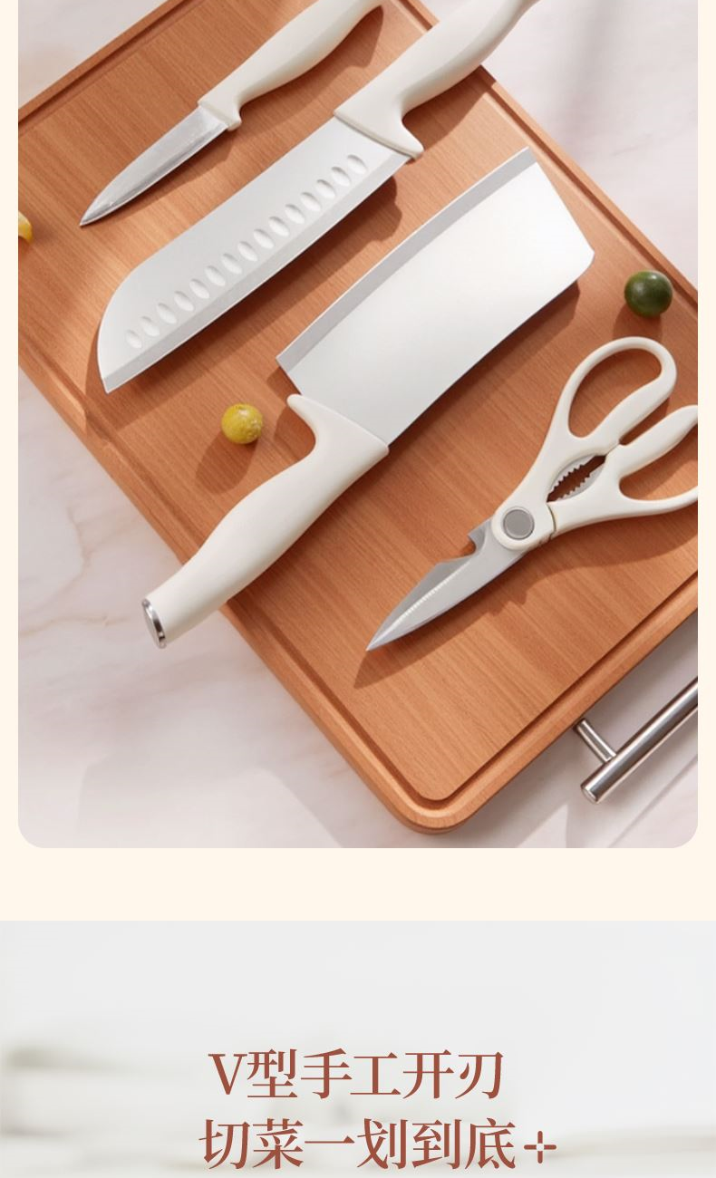 【型號】VE088 【SKU】VE08805 【材質(zhì)】不銹鋼+PP 【規(guī)格】 切片刀、廚師刀、水果刀、剪刀、收納底座 【凈重】0.75kg 【毛重】0.95kg 【包裝方式】郵購盒 【外箱尺寸】15.5*12*31.5cm 【顏色】銀色 V型手工開刃,鋒利切削; 人體工學(xué)手柄,握感舒適; 可拆洗刀座,清潔方便。